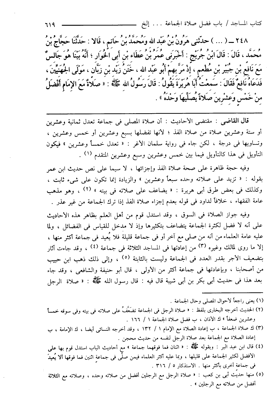 248 - (...) حدّثنى هَارُونُ بْنُ عَبْدِ اللهِ وَمُحَمَّدُ بْنُ حَاتِمٍ، قَالا: حَدَّثَنَا حَجَّاجُ بْنُ مُحَمَّدٍ، قَالَ: قَالَ ابْنُ جُرَيْجٍ: أَخْبَرَنِى عُمَرُ بْنُ عَطَاءِ بْنِ أَبِى الخُوَارِ؛ أَنَّهُ بَيْنَا هُوَ جَالِسٌ مَعَ نَافِعِ بْنِ جُبَيْر بْنِ مُطْعِمٍ، إِذْ مَرَّ بِهِمْ أَبُو عَبْدِ اللهِ، خَتَنُ زَيْدِ بْنِ زَبَّانٍ، مَوْلَى الجُهَنِيِّينَ، فَدَعَاهُ نَافِعٌ فَقَالَ: سَمِعْتُ أَبَا هُرَيْرَةَ يَقُولُ: قَالَ رَسُولُ اللهِ صَلَّى اللهُ عَلَيْهِ وَسَلَّمَ: " صَلاةٌ مَعَ الإِمَامِ أَفْضَلُ مِنْ خَمْسٍ وَعِشْرِينَ صَلاةً يُصَلِّيهَا وَحْدَهُ ".