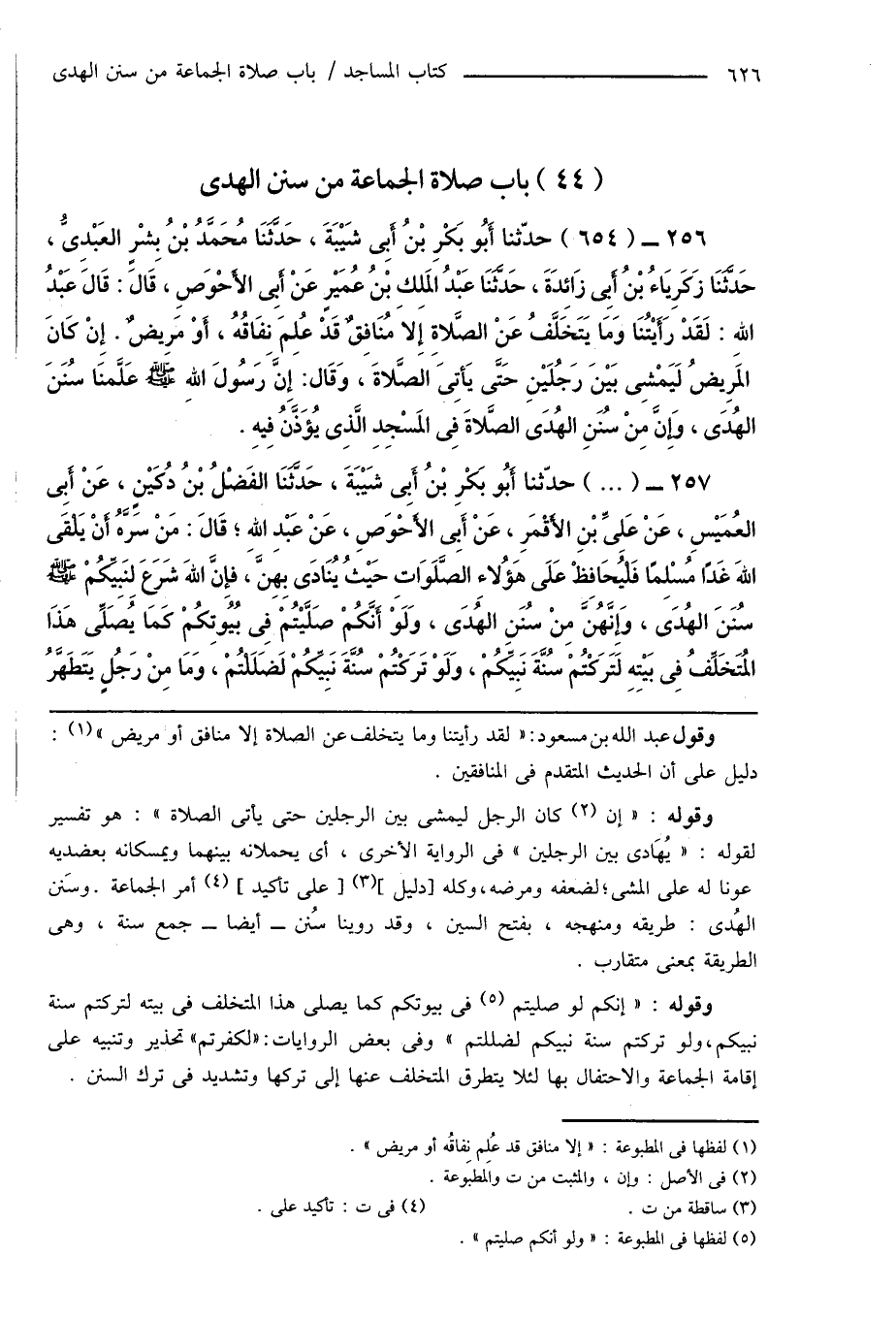 256 - (654) حدّثنا أَبُو بَكْرِ بْنُ أَبِى شَيْبَةَ، حَدَّثَنَا مُحَمَّدُ بْنُ بِشْرٍ العَبْدِىُّ، حَدَّثَنَا زَكَرِياءُ بْنُ أَبِى زَائِدَةَ، حَدَّثَنَا عَبْدُ المَلِكِ بْنُ عُمَيْرٍ عَنْ أَبِى الأَحْوَصِ، قَالَ: قَالَ عَبْدُ اللهِ: لَقَدْ رَأَيْتُنَا وَمَا يَتَخَلَّفُ عَنْ الصَّلاةِ إِلا مُنَافِقٌ قَدْ عُلِمَ نِفَاقُهُ، أَوْ مَرِيضٌ. إِنْ كَانَ المَرِيضُ لَيَمْشِى بَيْنَ رَجُلَيْنِ حَتَّى يَأتِىَ الصَّلاةَ، وَقَالَ: إِنَّ رَسُولَ اللهِ صَلَّى اللهُ عَلَيْهِ وَسَلَّمَ عَلَّمنَا سُنَنَ الهُدَى، وَإِنَ مِنْ سُنَنِ الهُدَى الصَّلاةَ فِى المَسْجِدِ الَّذِى يُؤَذَّنُ فِيهِ.