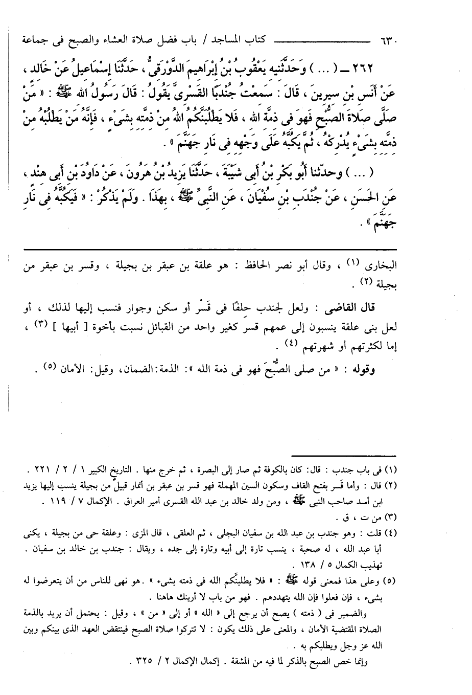 262 - (...) وَحَدَّثَنِيهِ يَعْقُوبُ بْنُ إِبْرَاهِيمَ الدَّوْرَقِىُّ، حَدَّثَنَا إِسْمَاعِيلُ عَنْ خَالِدٍ، عَنْ أَنَسِ بْنِ سِيرِينَ، قَالَ. سَمِعْتُ جُنْدَبًا القَسْرِىَّ يَقُولُ: قَالَ رَسُولُ اللهِ صَلَّى اللهُ عَلَيْهِ وَسَلَّمَ: " مَنْ صَلَّى صَلاةَ الصُّبْحِ فَهوَ فِى ذِمَّةِ اللهِ، فَلا يَطْلُبَنَّكُمُ اللهُ مِنْ ذِمَّتِهِ بِشَىْءٍ، فَإِنَّهُ مَنْ يَطْلُبْهُ مِنْ ذِمَّتِهِ بِشَىْءٍ يُدْرِكْهُ، ثُمَّ يَكُبَّهُ عَلَى وَجْهِهِ فِى نَارِ جَهَنَّمَ ".