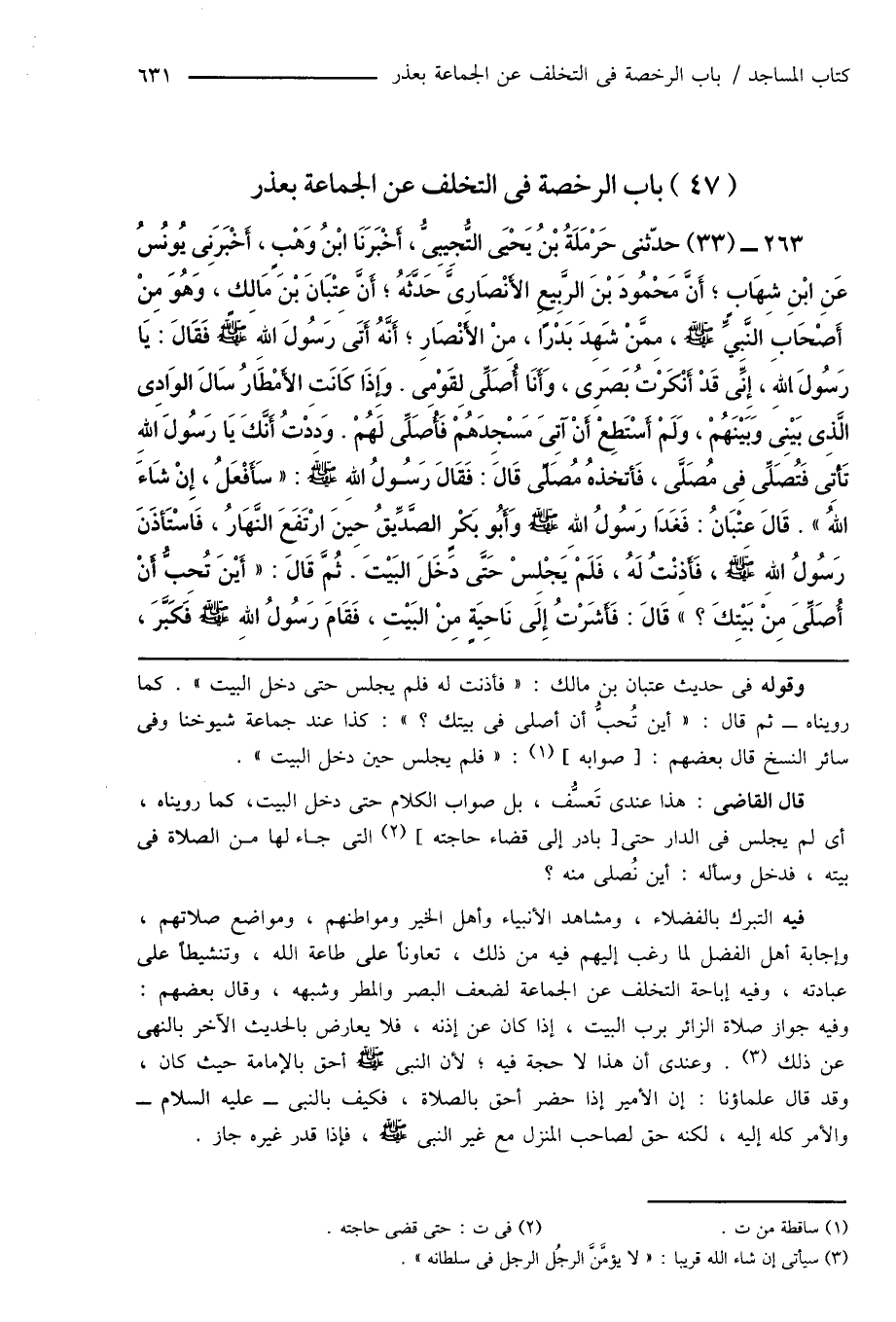 263 - (33) حدّثنى حَرْمَلَةُ بْنُ يَحْيَى التُّجِيبِىُّ، أَخْبَرَنَا ابْنُ وَهْبٍ، أَخْبَرَنِى يُونُس عَنِ ابْنِ شِهَابٍ؛ أَنَّ مَحْمُودَ بْنَ الرَّبِيعِ الأَنْصَارِىَّ حَدَّثَهُ؛ أَنَّ عِتْبَانَ بْنَ مَالِكٍ، وَهُوَ مِنْ أَصْحَابِ النَّبِىِّ صَلَّى اللهُ عَلَيْهِ وَسَلَّمَ، مِمَّنْ شَهِدَ بَدْرًا، منْ الأَنْصَارِ، أَنَّهُ أَتَى رَسُولَ اللهِ صَلَّى اللهُ عَلَيْهِ وَسَلَّمَ فَقَالَ: يَا رَسُولَ اللهِ، إِنِّى قَدْ أَنْكَرْتُ بَصَرِى، وَأَنَا أُصَلِّى لِقَوْمِى. وَإِذَا كَانَتِ الأَمْطَارُ سَالَ الوَادِى الَّذِى بَيْنِى وبَيْنَهُمْ، وَلَمْ أَسْتَطِعْ أَنْ آتِىَ مَسْجِدَهُمْ فَأُصَلِّى لَهُمْ. وَدِدْتُ أَنَّكَ يَا رَسُولَ اللهِ تَأْتِى فَتُصَلِّى فِى مُصَلَّى، فَأتخذهُ مُصَلى قَالَ: فَقَالَ رَسُولُ اللهِ صَلَّى اللهُ عَلَيْهِ وَسَلَّمَ: " سَأَفْعَلُ، إِنْ شَاءَ اللهُ ". قَالَ عِتْبَانُ: فَغَدَا رَسُولُ اللهِ صَلَّى اللهُ عَلَيْهِ وَسَلَّمَ وَأَبُو بَكْرٍ الصَّدِّيقُ حِينَ ارْتَفَعَ النَّهَارُ، فَاسْتَأْذَنَ رَسُولُ اللهِ صَلَّى اللهُ عَلَيْهِ وَسَلَّمَ، فَأَذِنْتُ لَهُ، فَلَمْ يَجْلِسْ حَتَّى دَخَلَ البَيْتَ. ثُمَّ قَالَ: " أَيْنَ تُحِبُّ أَنْ أُصَلِّىَ مِنْ بَيْتِكَ؟ " قَالَ: فَأَشَرْتُ إِلَى نَاحِيَةٍ مِنْ البَيْتِ، فَقَامَ رَسُولُ اللهِ صَلَّى اللهُ عَلَيْهِ وَسَلَّمَ فَكَبَّرَ،