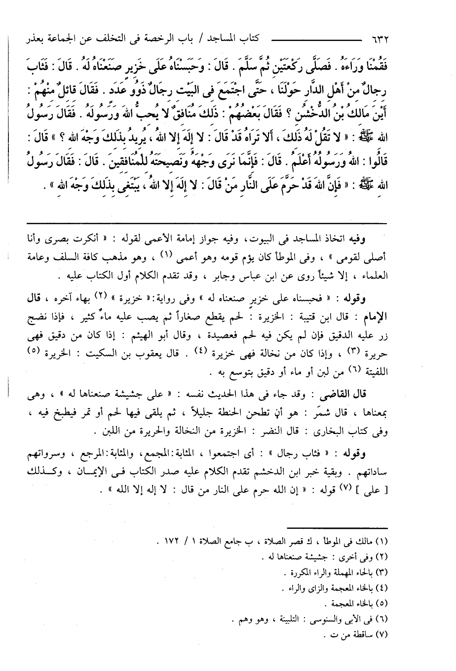 فَقُمْنَا وَرَاءَهُ. فَصَلَّى رَكْعَتَيْنِ ثُمَّ سَلَّمَ. قَالَ: وَحَبَسْنَاهُ عَلَى خَزِيرٍ صَنَعْنَاهُ لَهُ. قَالَ: فَثَابَ رِجِالٌ مِنْ أَهْلِ الدَّارِ حَوْلَنَا، حَتَّى اجْتَمَعَ فِى البَيْتِ رِجَالٌ ذَوُو عَدَدٍ. فَقَالَ قائِلٌ مِنْهُمْ: أَيْنَ مَالِكُ بْنُ الدُّخْشُنِ؟ فَقَالَ بَعْضُهُمْ: ذَلِكَ مُنَافِقٌ لا يُحِبُّ اللهَ وَرَسُولَهُ. فَقَالَ رَسُولُ اللهِ صَلَّى اللهُ عَلَيْهِ وَسَلَّمَ: " لا تَقُلْ لَهُ ذَلِكَ، أَلا تَرَاهُ قَدْ قَالَ: لا إِلَهَ إِلا اللهُ، يُرِيدُ بِذَلِكَ وَجْهَ اللهِ؟ " قَالَ: قَالُوا: اللهُ وَرَسُولُهُ أَعْلَمُ. قَالَ: فَإِنَّمَا نَرَى وَجْهَهُ وَنَصِيحَتَهُ لِلْمُنَافِقِينَ. قَالَ: فَقَالَ رَسُولُ اللهِ صَلَّى اللهُ عَلَيْهِ وَسَلَّمَ: " فَإِنَّ اللهَ قَدْ حَرَّمَ عَلَى النَّارِ مَنْ قَالَ: لا إِلَهَ إِلا اللهُ، يَبْتَغِى بِذَلِكَ وَجْهَ اللهِ ".