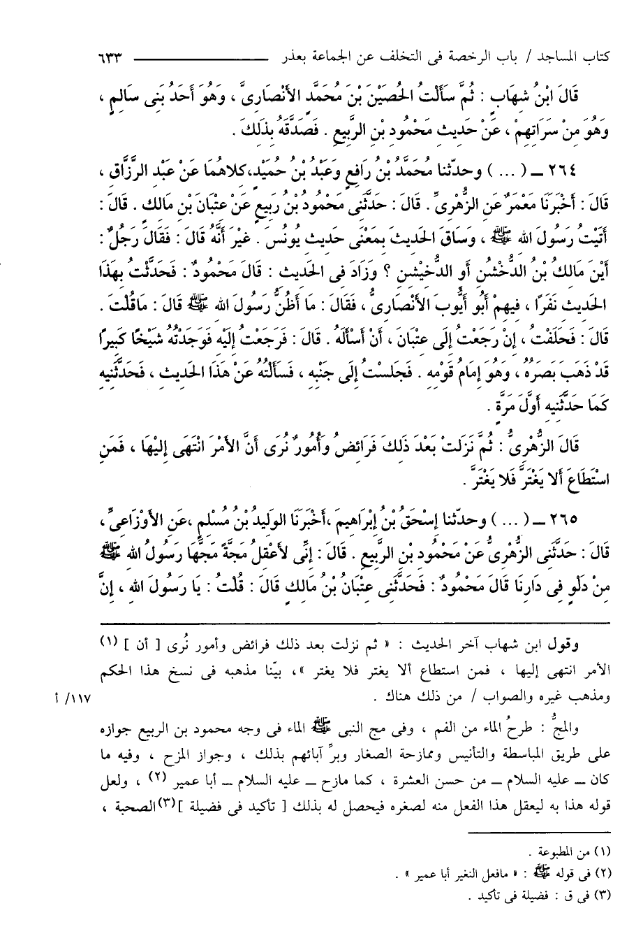 265 - (...) وحدّثنا إِسْحَاقُ بْنُ إِبْرَاهِيمَ، أَخْبَرَنَا الوَلِيدُ بْنُ مُسْلِمٍ، عَنِ الأَوْزَاعِىِّ، قَالَ: حَدَّثَنِى الزُّهْرِىُّ عَنْ مَحْمُودِ بْنِ الرَّبِيعِ. قَالَ: إِنِّى لأَعْقِلُ مَجَّةً مَجَّهَا رَسُولُ اللهِ صَلَّى اللهُ عَلَيْهِ وَسَلَّمَ مِنْ دَلْوٍ فِى دَارِنَا قَالَ مَحْمُودٌ: فَحَدَّثَنِى عِتْبَانُ بْنُ مَالِكٍ قَالَ: قُلْتُ: يَا رَسُولَ اللهِ، إِنَّ