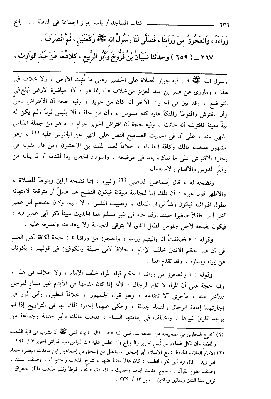 ونضحه له، قال إسماعيل القاضى (¬2) وغيره: إنما نضحه ليلين ويتوطأ للصلاة، والأظهر قول غيره: أن ذلك إما لنجاسة متيقنة فيكون النضح هنا غسلٌ أو متوقعة لامتهانه بطول افتراشه فيكون رشاً لزوال الشك، وتطييب النفس، لا سيما وكان عندهم أبو عمير أخو أنس طفلاً صغيراً حينئذ. وقد جاء فى غير مسلم هذا الحديث مبيناً ذكر أبى عمير فيه، فيكون نضحه لأجل جلوس الطفل الذى لا يتوقى النجاسة ولا يبعد منه وتصرفه عليه. وقوله: " فصففتُ أنا واليتيم وراءه، والعجوز من ورائنا ": حجة لكافة أهل العلم فى أن هذا حكم الاثنين خلف الإمام، خلافاً لأبى حنيفة والكوفيين فى قولهم: يكونان عن يمينه ويساره، وقد تقدم هذا.