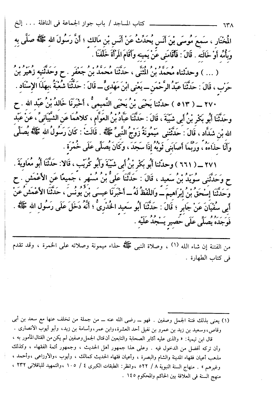 270 - (513) حدّثنا يَحْيَى بْنُ يَحْيَى التَّمِيمِىُّ، أَخْبَرَنَا خَالِدُ بْنُ عَبْدِ اللهِ. ح وحَدَّثَنَا أَبُو بَكْرِ بْنُ أَبِى شَيْبَةَ، قَالَ: حَدَّثَنَا عَبَّادُ بْنُ العَوَّامِ، كِلاهُمَا عَنِ الشَّيْبَانِىِّ، عَنْ عَبْدِ اللهِ بْنِ شَدَّادٍ، قَالَ: حَدَّثَتْنِى مَيْمُونَةُ زَوْجُ النَّبِىِّ صَلَّى اللهُ عَلَيْهِ وَسَلَّمَ. قَالَتْ: كَانَ رَسُولُ اللهِ صَلَّى اللهُ عَلَيْهِ وَسَلَّمَ يُصَلِّى وَأَنَا حِذَاءَهُ، وَرُبَّمَا أَصَابَنِى ثَوْبُهُ إِذَا سَجَدَ، وَكَانَ يُصَلِّى عَلَى خُمْرَةٍ.