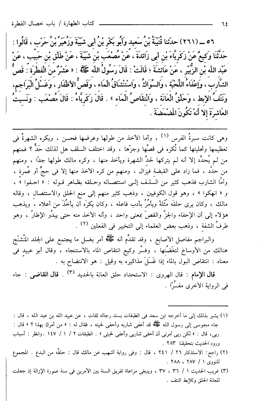56 - (261) حدّثنا قُتَيْبَةُ بْنُ سَعِيدٍ وَأَبُو بَكْرِ بْنُ أَبِى شَيْبَةَ وَزُهَيْرُ بْنُ حَرْبٍ، قَالُوا: حَدَّثَنَا وَكِيعٌ عَنْ زَكَرِيَّاءَ بْنِ أَبِى زَائِدَةَ، عَنْ مُصْعَبِ بْنِ شَيْبَةَ، عَنْ طَلْقِ بْنِ حَبِيبٍ، عَنْ عَبْدِ اللهِ بْنِ الزُّبَيْرِ، عَنْ عَائِشَةَ؛ قَالَتْ: قَالَ رَسُولُ اللهِ صَلَّى اللهُ عَلَيْهِ وَسَلَّمَ: " عَشْرٌ مِنَ الْفِطْرَةِ: قَصُّ الشَّارِبِ، وَإعْفَاءُ اللِّحْيَةِ، وَالسِّوَاكُ، وَاسْتنْشَاقُ الْمَاءِ، وَقَصُّ الأَظْفَارِ، وَغَسْلُ الْبَرَاجِمِ، وَنَتْفُ الإبِطِ، وَحَلْقُ الْعَانَةِ، وَانْتِقَاصُ الْمَاءِ ". قَالَ زَكَرِيَّاءُ: قَالَ مُصْعَب: وَنَسِيتُ العَاشِرَةَ إِلا أَنْ تَكُونَ المَضْمَضَةَ.