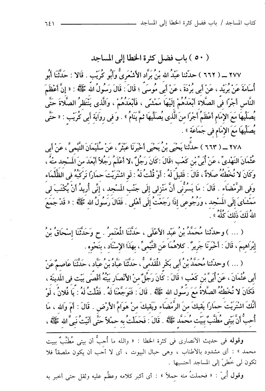 278 - (663) حدَّثنا يَحْيَى بْنُ يَحْيَى أَخْبَرَنَا عَبْثَرٌ، عَنْ سُلَيْمَانَ التَّيْمِىِّ، عَنْ أَبِى عُثْمَانُ النَهْدِىِّ، عَنْ أُبَىِّ بْنِ كَعْبٍ؛ قَالَ: كَانَ رَجُلٌ، لا أَعْلَمُ رَجُلاً أَبْعَدَ مِنَ المَسْجِدِ مِنْهُ، وَكَانَ لا تُخْطِئُهُ صَلاةٌ، قَالَ: فَقِيلَ لَهُ: أَوْ قُلْتُ لَهُ: لَوِ اشْتَرَيْتَ حِمَارًا تَرْكَبُهُ فِى الظَّلْمَاءِ وَفِى الرَّمْضَاءِ. قَالَ: مَا يَسُرُّنِى أَنَّ مَنْزِلِى إِلَى جَنْبِ المَسْجِدِ، إِنِّى أُرِيدُ أَنْ يُكْتَبَ لِى مَمْشَاىَ إِلَى الَمَسْجِدِ، وَرُجُوعِى إِذَا رَجَعْتُ إِلَى أَهْلِىَ. فَقَالَ رَسُولُ اللهِ صَلَّى اللهُ عَلَيْهِ وَسَلَّمَ: " قَدْ جَمَعَ اللهُ لَكَ ذَلِكَ كُلَّهُ ".
