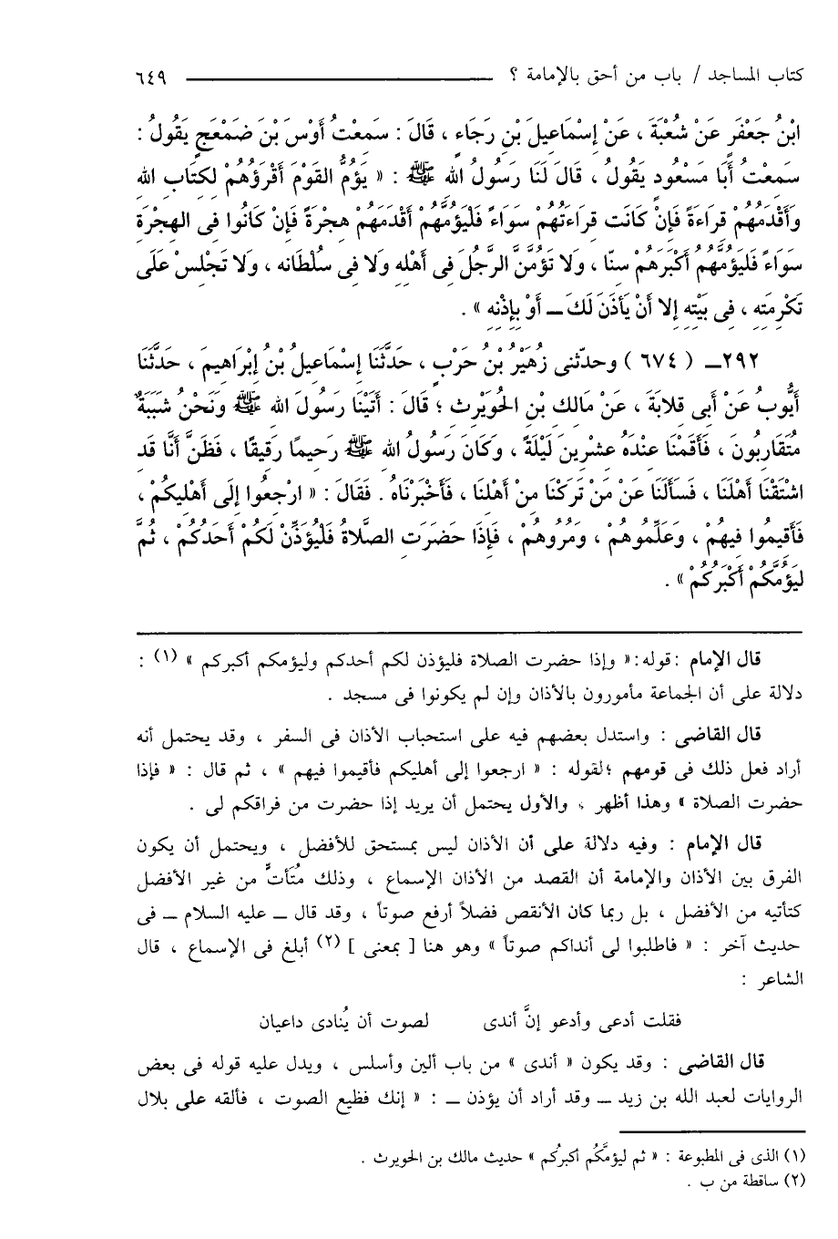 292 - (674) وحدّثنى زُهَيْرُ بْنُ حَرْبٍ، حَدَّثَنَا إِسْمَاعِيلُ بْنُ إِبْرَاهِيمَ، حَدَّثَنَا أَيُّوبُ عَنْ أَبِى قِلابَةَ، عَنْ مَالِكِ بْنِ الحُوَيْرِثِ؛ قَالَ: أَتَيْنَا رَسُولَ اللهِ صَلَّى اللهُ عَلَيْهِ وَسَلَّمَ وَنَحْنُ شَبَبَةٌ مُتَقَارِبُونَ، فَأَقَمْنَا عِنْدَهُ عِشْرِينَ لَيْلَةً، وَكَانَ رَسُولُ اللهِ صَلَّى اللهُ عَلَيْهِ وَسَلَّمَ رَحِيمًا رَقِيقًا، فَظَنَّ أَنَّا قَدِ اشْتَقْنَا أَهْلَنَا، فَسَأَلَنَا عَنْ مَنْ تَرَكْنَا مِنْ أَهْلِنَا، فَأَخْبَرْنَاهُ. فَقَالَ: " ارْجِعُوا إِلَى أَهْلِيكُمْ، فَأَقِيمُوا فِيهُمْ، وَعَلِّمُوهُمْ، وَمُرُوهُمْ، فَإِذَا حَضَرَتِ الصَّلاةُ فَلْيُؤَذِّنْ لَكُمْ أَحَدُكُمْ، ثُمَّ ليَؤُمَّكُمْ أَكْبَرُكُمْ ".