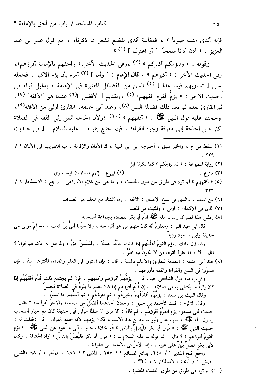 (¬9) عند أبى حنيفة: التقدمة للقارئ والأعلم بالسنة، قال: فإن استوَوا فى العلم والقراءة فأكثرهم سِنًّا، فإن استوَوا فى السن والقراءة والفقه فأورعهم.