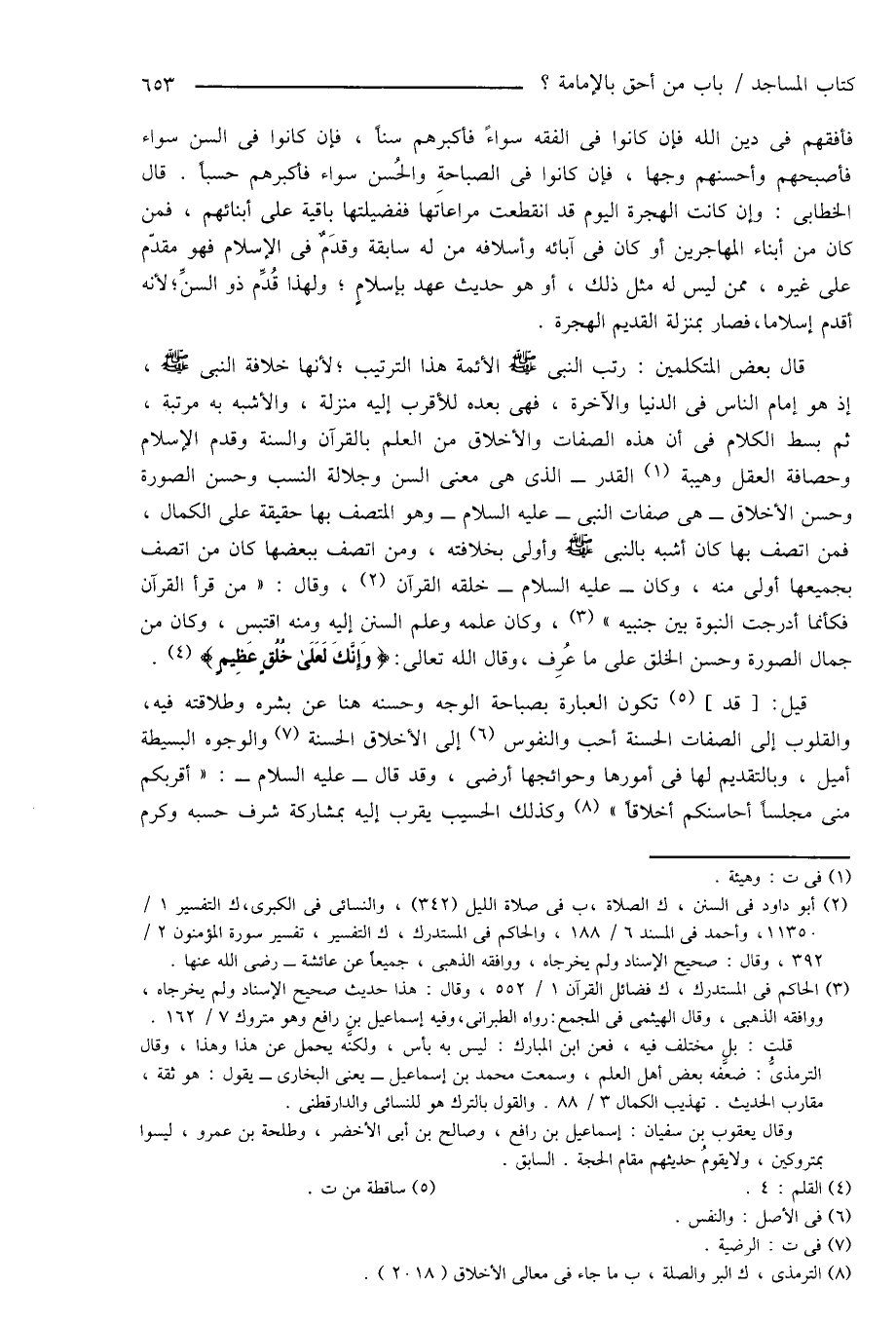 قال بعض المتكلمين: رتب النبى صَلَّى اللهُ عَلَيْهِ وَسَلَّمَ الأئمة هذا الترتيب؛ لأنها خلافة النبى صَلَّى اللهُ عَلَيْهِ وَسَلَّمَ، إذ هو إمام الناس فى الدنيا والآخرة، فهى بعده للأقرب إليه منزلة، والأشبه به مرتبة، ثم بسط الكلام فى أن هذه الصفات والأخلاق من العلم بالقرآن والسنة وقدم الإسلام وحصافة العقل وهيبة (¬1) القدر - الذى هى معنى السن وجلالة النسب وحسن الصورة وحسن الأخلاق - هى صفات النبى - عليه السلام - وهو المتصف بها حقيقة على الكمال، فمن اتصف بها كان أشبه بالنبى صَلَّى اللهُ عَلَيْهِ وَسَلَّمَ وأولى بخلافته، ومن اتصف ببعضها كان من اتصف بجميعها أولى منه، وكان - عليه السلام - خلقه القرآن (¬2)، وقال: " من قرأ القرآن فكأنما أدرجت النبوة بين جنبيه " (¬3)، وكان علمه وعلم السنن إليه ومنه أقتبس، وكان من جمال الصورة وحسن الخلق على ما عُرِف، وقال الله تعالى: {وَإِنَّكَ لَعَلَى خُلُقٍ عَظِيمٍ} (¬4).