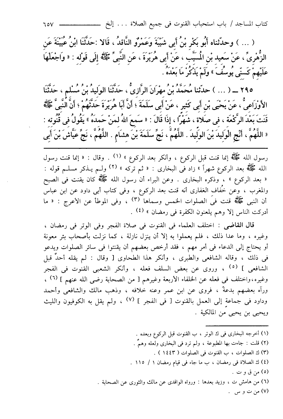 قال القاضى: اختلف العلماء فى القنوت فى صلاة الفجر وفى الوتر فى رمضان، وغيره، وما عدا ذلك، فلم يعملوا به إِلا أن ينزل نازلة، كما نزلت بأصحاب بئر معونة أو يحتاج إلى الدعاء فى أمر مهم، فقد أرخص بعضهم أن يقنتوا فى سائر الصلوات ويدعو فى ذلك، وقاله الشافعى والطبرى، وأنكر هذا الطحاوى [وقال: لم يقله أحدٌ قبل الشافعى] (¬5)، وروى عن بعض السلف فعله، وأنكر الشعبى القنوت فى الفجر وغيره، واختلف فى فعله عن الخلفاء الأربعة وغيرهم [من الصحابة رضى الله عنهم] (¬6)، ورآه بعضهم بدعةً، فروى عن ابن عمر وعنه خلافه، وذهب مالك والشافعى وأحمد وداود فى جماعةٍ إلى العمل بالقنوت [فى الفجر] (¬7)، ولم يقل به الكوفيون والليث ويحيى بن يحيى من المالكية.
