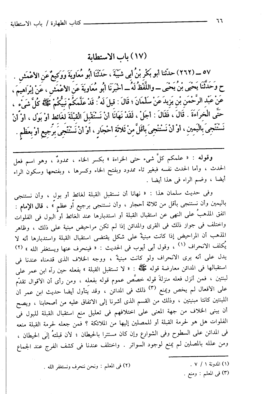 7 - (262) حدّثنا أبو بَكْرِ بْنُ أبِى شَيْبَةَ، حَدَّثَنَا أَبُو مُعَاوِيَةَ وَوَكِيعٌ عَنِ الأَعْمَشِ. ح وَحَدَّثَنَا يَحْيَى بْنُ يَحْيَى - واللَّفْظُ لَهُ - أَخْبَرَنَا أَبُو مُعَاوِيَةَ عَنِ الأَعْمَشِ، عَنْ إِبْرَاهِيمَ، عَنْ عَبْدِ الرَّحْمَنِ بْنِ يَزِيدَ عَنْ سَلْمَانَ؛ قَالَ: قِيلَ لَهُ: قَدْ عَلَّمَكُمْ نَبِيُّكُمْ صَلَّى اللهُ عَلَيْهِ وَسَلَّمَ كُلَّ شَىْءٍ، حَتَّى الْخِرَاءَةَ. قَالَ، فَقَالَ: أجَلْ، لَقَدْ نَهَانَا أَنْ نَسْتَقْبِلَ الْقِبْلَةَ لِغَائِطٍ أَوْ بَوْل، أَوْ أَنْ نَسْتَنْجِىَ بِالْيَمِينِ، أَوْ أَنْ نَسْتنْجِىَ بِأقَلَّ مِنْ ثَلاثَةِ أحْجَارٍ، أَوْ أَنْ نَسْتَنْجِىَ بِرَجِيعٍ أَوْ بِعَظْمٍ.