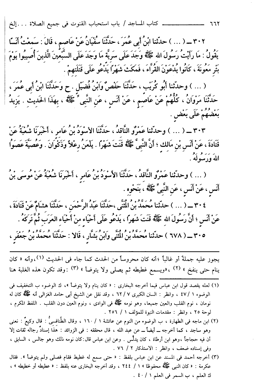304 - (...) حدّثنا مُحَمَّدُ بْنُ المُثَنَّى، حَدَّثَنَا عَبْدُ الرَّحْمَنِ، حَدَّثَنَا هِشَامٌ عَنْ قَتَادَةَ، عَنْ أَنَسٍ؛ أَنَّ رَسُولَ اللهِ صَلَّى اللهُ عَلَيْهِ وَسَلَّمَ قَنَتَ شَهرًا، يَدْعُو عَلَى أَحْيَاءٍ مِنْ أَحْيَاءِ العَرَبِ ثُمَّ تَرَكَهُ.
