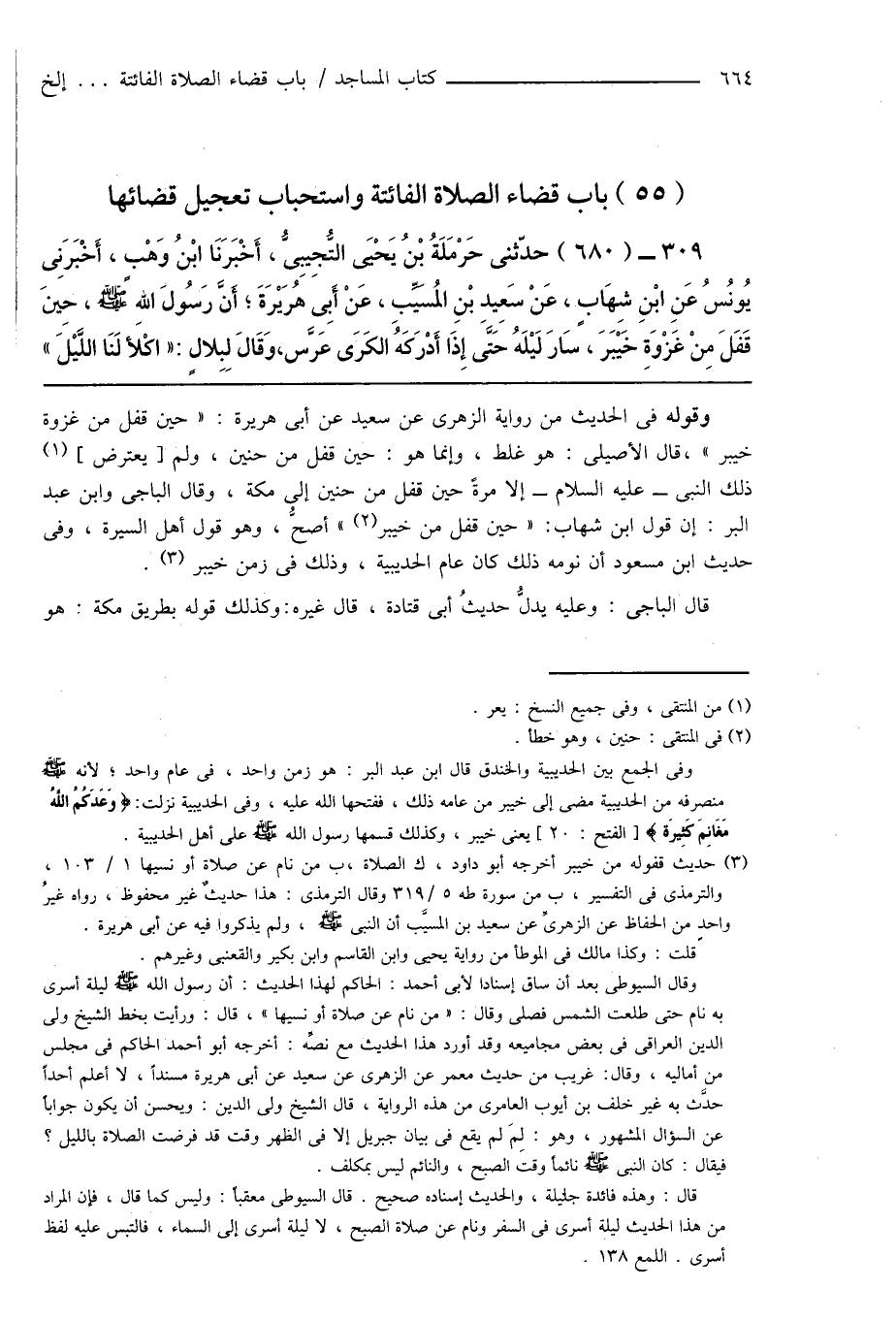 (¬3) حديث قفوله من خيبر أخرجه أبو داود، ك الصلاة، ب من نام عن صلاة أو نسيها 1/ 103، والترمذى فى التفسير، ب من سورة طه 5/ 319 وقال الترمذى: هذا حديثٌ غير محفوظ، رواه غيرُ واحدٍ من الحفاظ عن الزهرىِّ عن سعيد بن المسيَّب أن النبى صَلَّى اللهُ عَلَيْهِ وَسَلَّمَ، ولم يذكروا فيه عن أبى هريرة.