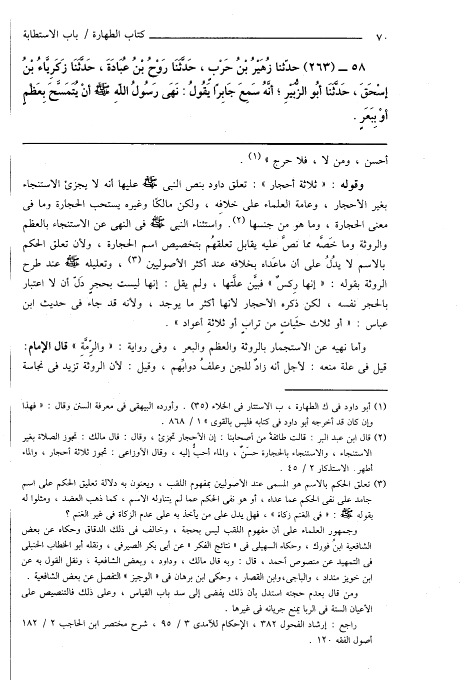 58 - (263) حدّثنا زُهَيْرُ بْنُ حَرْبٍ، حَدَّثَنَا رَوْحُ بْنُ عُبَادَةَ، حَدَّثَنَا زَكَرِيَّاءُ بْنُ إِسْحَاقَ، حَدَّثَنَا أَبُو الزُّبَيْرِ؛ أَنَّهُ سَمِعَ جَابِرًا يَقُولُ: نَهَى رسُولُ اللهِ صَلَّى اللهُ عَلَيْهِ وَسَلَّمَ أَنْ يُتَمَسَّحَ بِعَظْمٍ أَوْ بِبَعَرٍ.