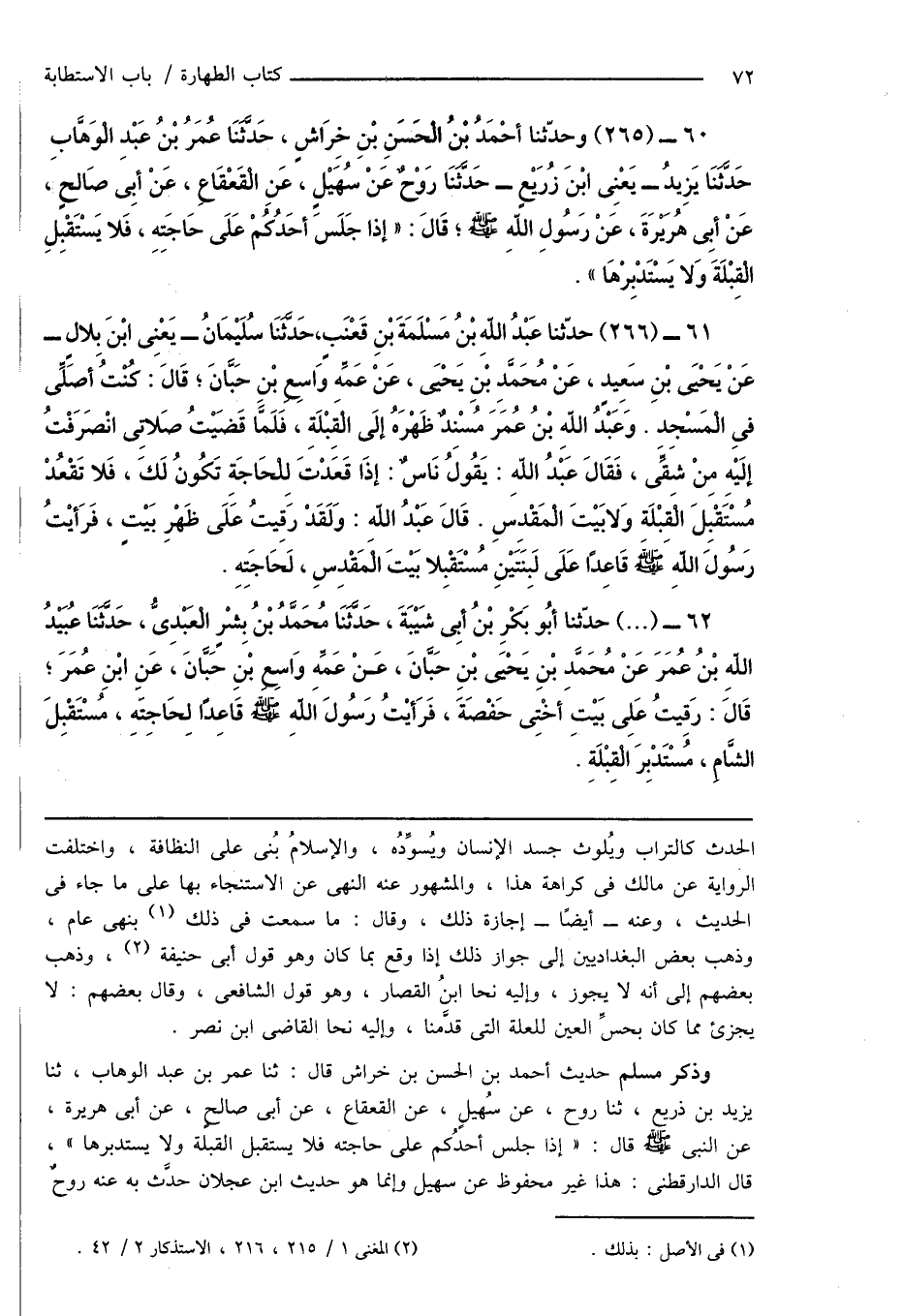 61 - (266) حدّثنا عَبْدُ اللهِ بْنُ مَسْلَمَةَ بْنِ قَعْنَبٍ، حَدَّثَنَا سُلَيْمَانُ - يَعْنِى ابْنَ بِلالٍ - عَنْ يَحْيَى بْنِ سَعِيدٍ، عَنْ مُحَمَّدِ بْنِ يَحْيَى، عَنْ عَمِّهِ وَاسِعِ بْنِ حَبَّانَ؛ قَالَ: كُنْتُ أصَلِّى فِى الْمَسْجِدِ. وَعَبْدُ اللهِ بْنُ عُمَرَ مُسْنِدٌ ظَهْرَهُ إِلَى الْقَبْلَةِ، فَلَمَّا قَضَيْتُ صَلاِتى انْصَرَفْتُ إلَيْهِ مِنْ شِقِّى، فَقَالَ عَبْدُ اللهِ: يَقُولُ نَاسٌ: إِذَا قَعَدْتَ لِلْحَاجَةِ تَكُونُ لَكَ، فَلا تَقْعُدْ مُسْتَقْبِلَ الْقِبْلَةِ وَلا بَيْتَ الْمَقْدِسِ. قَالَ عَبْدُ اللهِ: وَلَقَدْ رَقِيتُ عَلَى ظَهْرِ بَيْتٍ، فَرَأيْتُ رَسُولَ اللهِ صَلَّى اللهُ عَلَيْهِ وَسَلَّمَ قَاعِدًا عَلَى لَبِنَتَيْنِ مُسْتَقْبِلاً بَيْتَ الْمَقْدِسِ، لَحَاجَتِهِ.