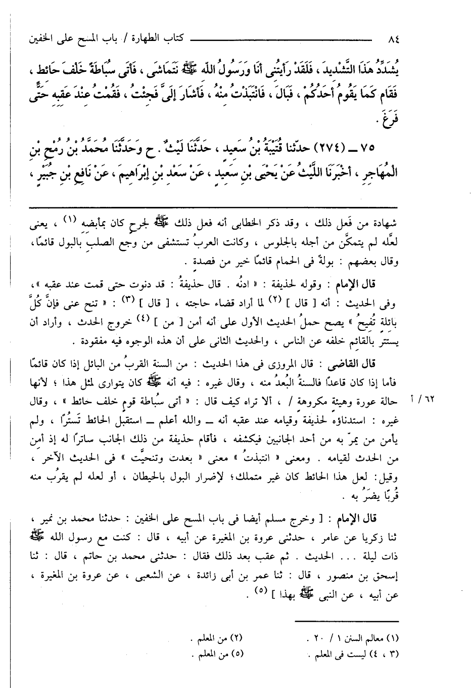 قال الإمام: [وخرج مسلم أيضاً فى باب المسح على الخفين: حدثنا محمد بن نمير، ثنا زكريا عن عامر، حدثنى عروة بن المغيرة عن أبيه، قال: كنت مع رسول الله صَلَّى اللهُ عَلَيْهِ وَسَلَّمَ ذات ليلة ... الحديث. ثم عقب بعد ذلك فقال: حدثنى محمد بن حاتم، قال: ثنا إسحاق بن منصور، قال: ثنا عمر بن أبى زائدة، عن الشعبى، عن عروة بن المغيرة، عن أبيه، عن النبى صَلَّى اللهُ عَلَيْهِ وَسَلَّمَ بهذا] (¬5).