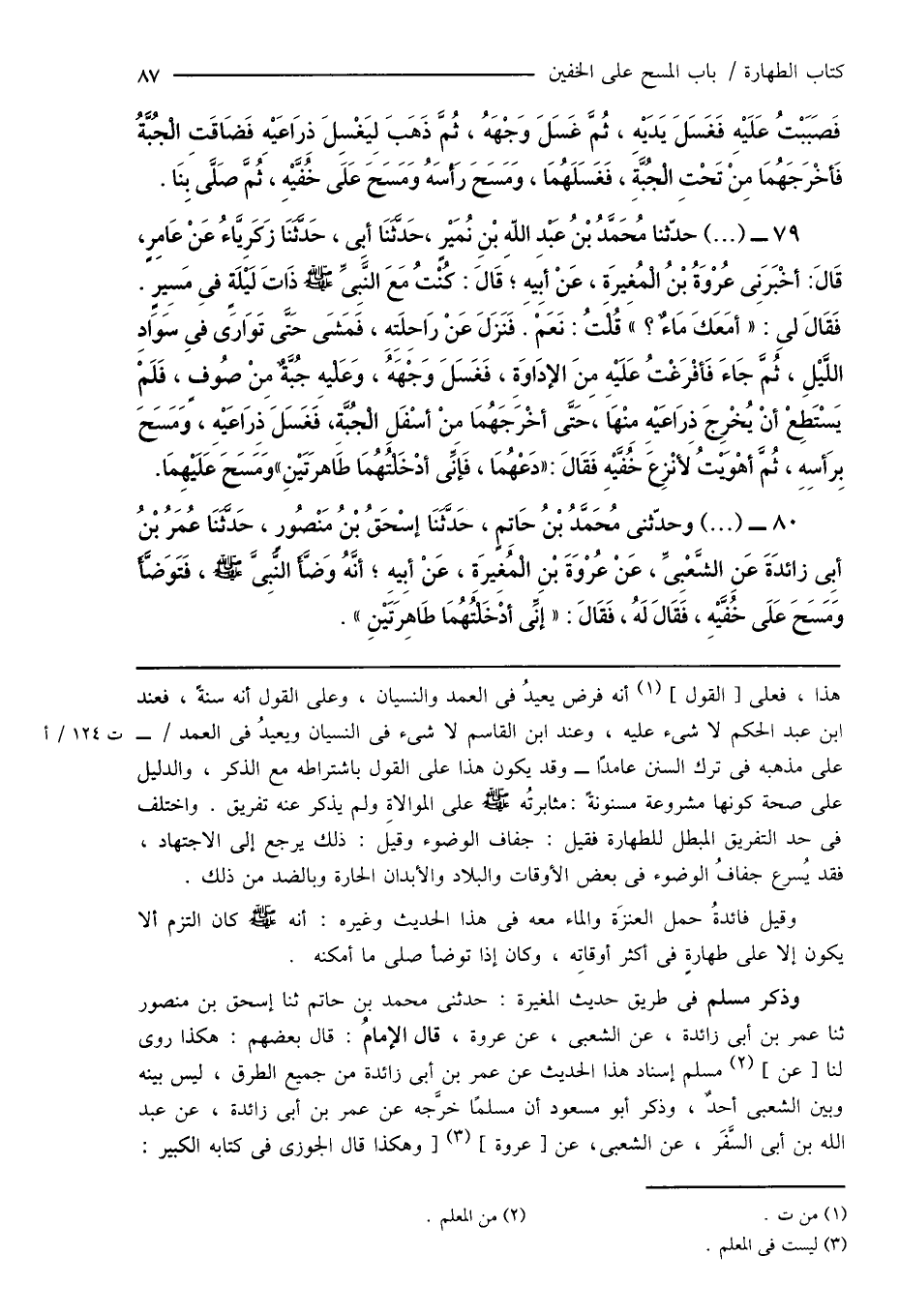 79 - (...) حدّثنا مُحَمَّدُ بْنُ عَبْدِ الله بْنِ نُمَيْرٍ، حَدَّثَنَا أبى، حَدَّثَنَا زَكَرِيَّاءُ عَنْ عَامِرٍ، قَالَ: أَخْبَرَنِى عُرْوَةُ بْنُ الْمُغِيرَةِ، عَنْ أَبِيهِ؛ قَالَ: كُنْتُ مَعَ النَّبِىِّ صَلَّى اللهُ عَلَيْهِ وَسَلَّمَ ذَاتَ لَيْلَةٍ فِى مَسِيرٍ. فَقَالَ لِى: " أمَعَكَ مَاءٌ؟ " قُلْتُ: نَعَمْ. فَنَزَلَ عَنْ رَاحِلَتِهِ، فَمَشَى حَتَّى تَوَارَى فِى سَوَادِ اللَّيْلِ، ثُمَّ جَاءَ فَأفْرَغْتُ عَلَيْهِ مِنَ الإدَاوَةِ، فَغَسَلَ وَجْهَهُ، وَعَلَيْهِ جُبَّةٌ مِنْ صُوفٍ، فَلَمْ يَسْتَطِعْ أَنْ يُخْرِجَ ذرَاعَيْهِ مِنْهَا، حَتَّى أخْرَجَهُمَا منْ أسْفَلِ الْجُبَّةِ، فَغَسَلَ ذِرَاعَيْهِ، وَمَسَح بِرَأسِهِ، ثُمَّ أهْوَيْتُ لَأنْزِعَ خُفَّيْهِ فَقَالَ: "دَعْهُمَا، فَإِنِّى أدْخَلتُهُمَا طَاهِرَتَيْنِ " وَمَسَحَ عَلَيْهِمَا.