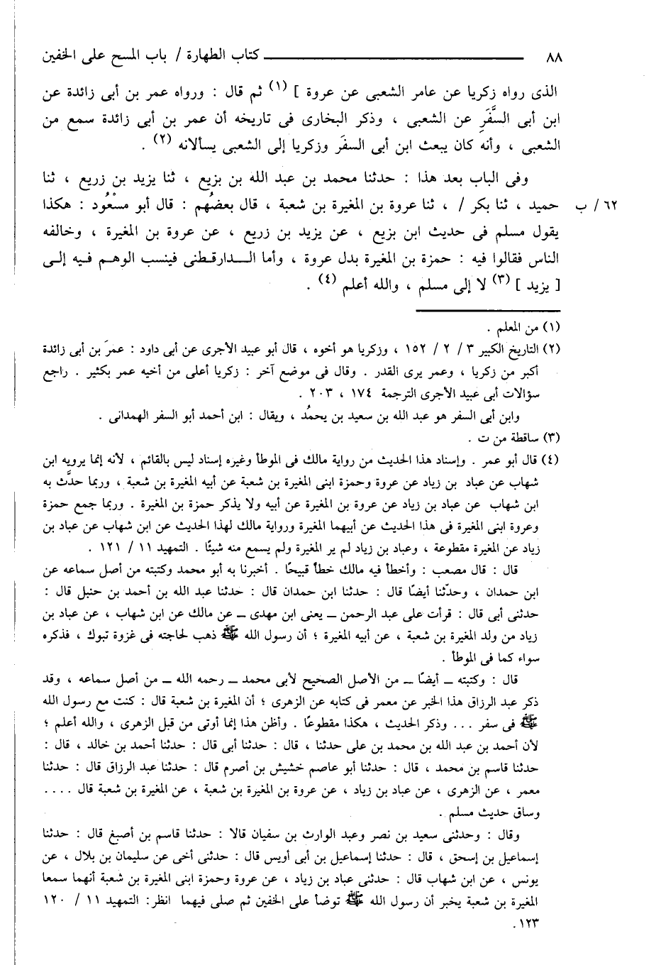 وقال: وحدثنى سعيد بن نصر وعبد الوارث بن سفيان قالا: حدثنا قاسم بن أصبغ قال: حدثنا إسماعيل بن إسحاق، قال: حدثنا إسماعيل بن أبى أويس قال: حدثنى أخى عن سليمان بن بلال، عن يونس، عن ابن شهاب قال: حدثنى عباد بن زياد، عن عروة وحمزة ابنى المغيرة بن شعبة أنهما سمعا المغيرة بن شعبة يخبر أن رسول الله صَلَّى اللهُ عَلَيْهِ وَسَلَّمَ توضأ على الخفين ثم صلى فيهما انظر: التمهيد 11/ 120 - 123.