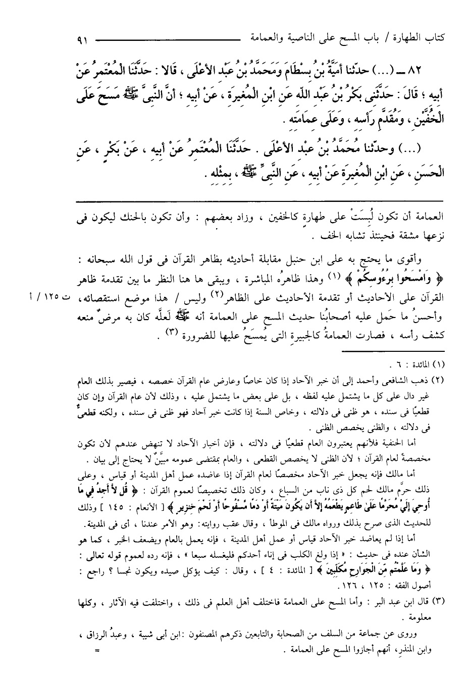 (¬3) قال ابن عبد البر: وأما المسح على العمامة فاختلف أهل العلم فى ذلك، واختلفت فيه الآثار، وكلها معلومة.