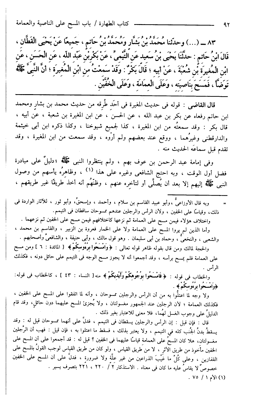 83 - (...) وحدّثنا مُحَمَّدُ بْنُ بَشَّارٍ وَمُحَمَّدُ بْنُ حَاتِمٍ، جَمِيعًا عَنْ يَحْيَى الْقَطَّانِ، قَالَ ابْنُ حَاتِمٍ: حَدَّثَنَا يَحْيَى بْنُ سَعِيدٍ عَنِ التَّيْمِىِّ، عَنْ بَكْرِ بْنِ عَبْدِ اللهِ، عَنِ الْحَسَنِ، عَنِ ابْن الْمُغِيرَةِ بْنِ شُعْبَةَ، عَنْ أَبِيهِ؛ قَالَ بَكْرٌ: وَقَدْ سَمِعْتُ مِنِ ابْنِ الْمُغِيرَةِ؛ أَنَّ النَّبِىَّ صَلَّى اللهُ عَلَيْهِ وَسَلَّمَ تَوَضَّأَ، فَمَسَحَ بِنَاصِيَتِهِ، وَعَلَى الْعِمَامَةِ، وَعَلَى الْخُفَّيْنِ.