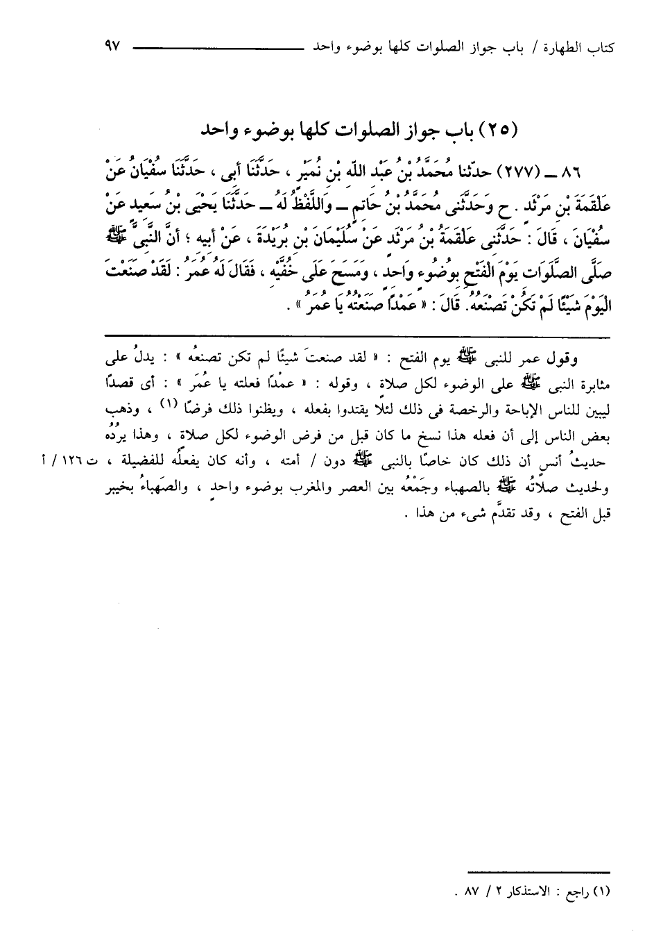 86 - (277) حدّثنا مُحَمَّدُ بْنُ عَبْدِ اللهِ بْنِ نُمَيْرٍ، حَدَّثَنَا أبى، حَدَّثَنَا سُفْيَانُ عَنْ عَلْقَمَةَ بْنِ مَرْثَدٍ. ح وَحَدَّثَنِى مُحَمَّدُ بْنُ حَاتِمٍ - وَاللَّفْظُ لَهُ - حَدَّثَنَا يَحْيَى بْنُ سَعِيدٍ عَنْ سُفْيَانَ، قَالَ: حَدَّثَنِى عَلْقَمَةُ بْنُ مَرْثَدٍ عَنْ سُلَيْمَانَ بْنِ بُرَيْدَةَ، عَنْ أَبِيهِ؛ أَنَّ النَّبِىَّ صَلَّى اللهُ عَلَيْهِ وَسَلَّمَ صَلَّى الصَّلَوَات يَوْمَ الْفَتْحِ بِوُضُوءٍ وَاحِدٍ، وَمَسَحَ عَلَى خُفَّيْهِ، فَقَالَ لَهُ عُمَرُ: لَقَدْ صَنَعْتَ الْيَوْمَ شَيْئًا لَمْ تَكُنْ تَصْنَعُهُ. قَالَ: " عَمْدًا صَنَعْتُهُ يَا عُمَرُ ".