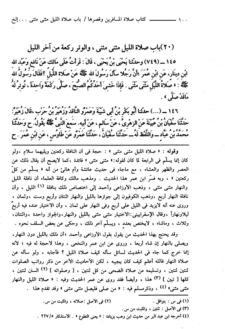 145 - (749) وحدّثنا يَحْيَى بْنُ يَحْيَى، قَالَ: قَرَأْتُ عَلَى مَالِكٍ عَنْ نَافِعٍ وَعَبْدِ اللهِ ابْنِ دِينَارٍ، عَنِ ابْنِ عُمَرَ؛ أَنَّ رَجُلاً سَأَلَ رَسُولَ اللهِ صَلَّى اللهُ عَلَيْهِ وَسَلَّمَ عَنْ صَلاةِ اللَّيْلِ؟ فَقَالَ رَسُولُ اللهِ صَلَّى اللهُ عَلَيْهِ وَسَلَّمَ: " صَلاةُ اللَّيْلِ مَثْنَى مَثْنَى. فَإِذَا خَشِىَ أَحَدُكُمُ الصُّبْحَ، صَلَّى رَكْعَةً وَاحِدَةً، تُوتِرُ لَهُ مَا قَدْ صَلَّى ".