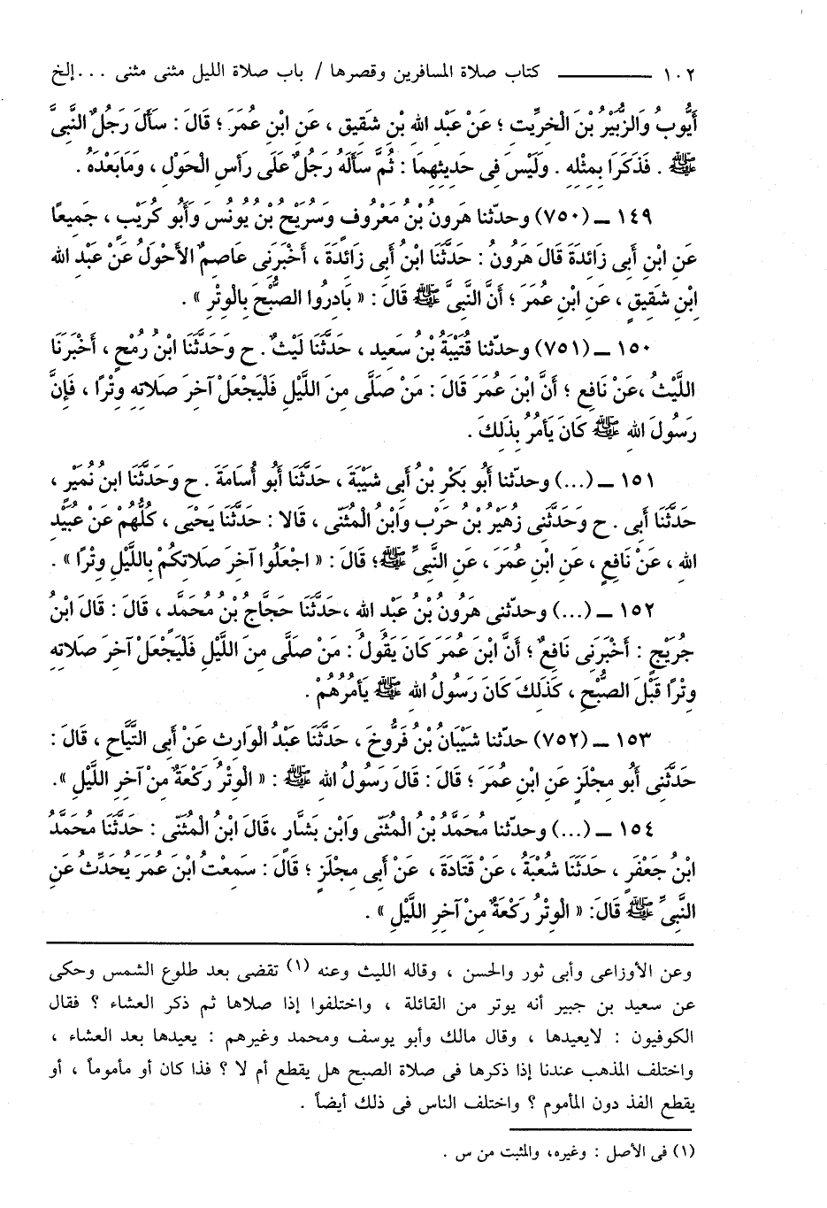 152 - (...) وحدَّثنى هَارُونُ بْنُ عَبْدِ اللهِ، حَدَّثَنَا حَجَّاجُ بْنُ مُحَمَّدٍ، قَالَ: قَالَ ابْنُ جُرَيْجٍ: أَخْبَرَنِى نَافِعٌ؛ أَنَّ ابْنَ عُمَرَ كَانَ يَقُولُ: مَنْ صَلَّى مِنَ اللَّيْلِ فَلْيَجْعَلْ آخِرَ صَلاتِهِ وِتْرًا قَبْلَ الصُّبْحِ، كَذَلِكَ كَانَ رَسُولُ اللهِ صَلَّى اللهُ عَلَيْهِ وَسَلَّمَ يَأمُرُهُمْ.