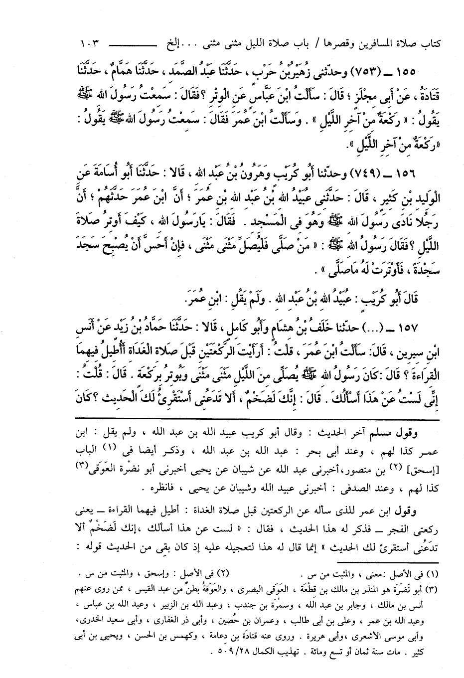 157 - (...) حدّثنا خَلَفُ بْنُ هِشَامٍ وَأَبُو كَامِلٍ، قَالا: حَدَّثَنَا حَمَّادُ بْنُ زَيْدٍ عَنْ أَنَسِ ابْنِ سِيرِين، قَالَ: سَأَلْتُ ابْنَ عُمَرَ، قَلتُ: أَرَأَيْتَ الرَّكْعَتَيْنِ قَبْلَ صَلاةِ الْغَدَاةِ أَأَطِيلُ فِيهِمَا الْقِرَاءةَ؟ قَالَ: كَانَ رَسُولُ اللهِ صَلَّى اللهُ عَلَيْهِ وَسَلَّمَ يُصَلِّى مِنَ اللَّيْلِ مَثْنَى مَثْنَى وَيُوتِرُ بِرَكْعَةٍ. قَالَ: قُلْتُ: إِنِّى لَسْتُ عَنْ هَذَا أَسْأَلُكَ. قَالَ: إِنَّكَ لَضَخْمٌ، أَلا تَدَعُنِى أَسْتَقْرِئُ لَكَ الْحَدِيث؟ كَانَ