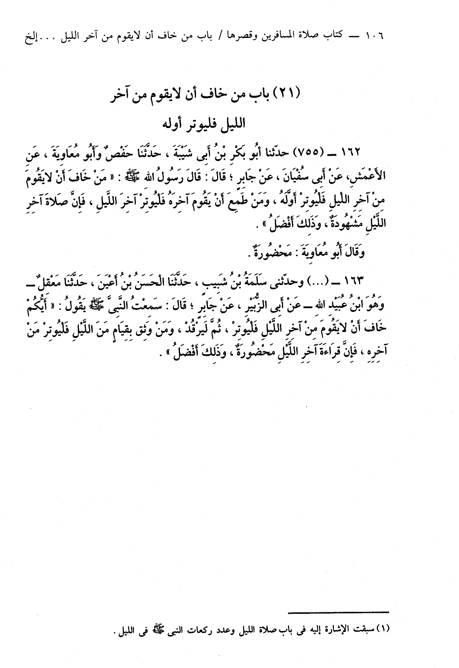 163 - (...) وحدَّثنى سَلَمَةُ بْنُ شَبِيبٍ، حَدَّثَنَا الْحَسَنُ بْنُ أَعْيَنَ، حَدَّثَنَا مَعْقِلٌ - وَهُوَ ابْنُ عُبَيْدِ اللهِ - عَنْ أَبِى الزُّبَيْرِ، عَنْ جَابِرٍ؛ قَالَ: سَمِعْتُ النَّبِىَّ صَلَّى اللهُ عَلَيْهِ وَسَلَّمَ يَقُولُ: " أَيُّكُمْ خَافَ أَنْ لا يَقُومَ مِنْ آخِرِ اللَّيْلِ فَلْيُوتِرْ، ثُمَّ ليَرْقُدْ، وَمَنْ وَثِق بِقِيَامٍ منَ اللَّيْلِ فَلْيُوتِرْ مَنْ آخِرِهِ، فَإِنَّ قِرَاءَةَ آخِرِ اللَّيْلِ مَحْضُورَةٌ، وَذَلِكَ أَفْضَلُ ".