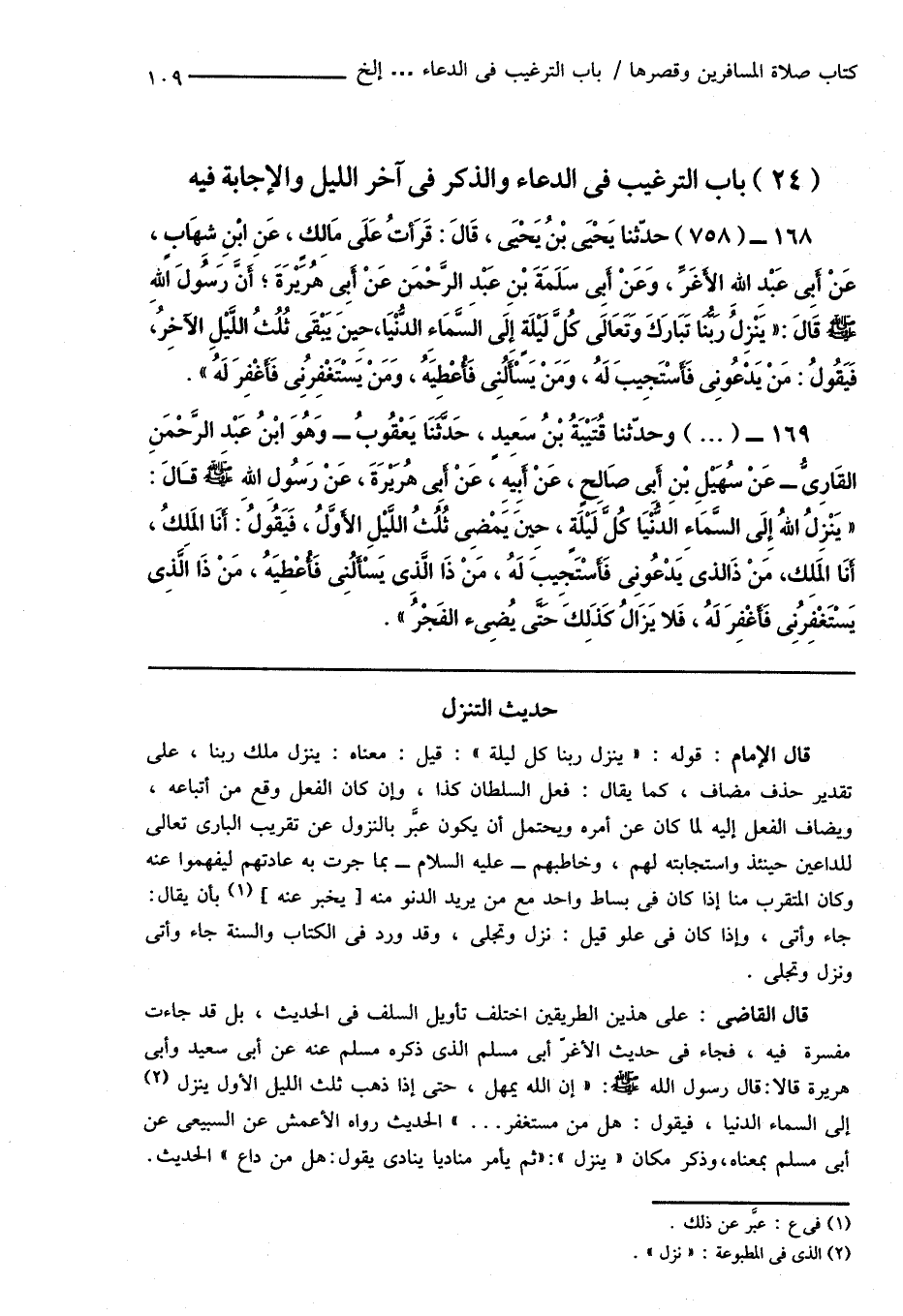 قال القاضى: على هذين الطريقين اختلف تأويل السلف فى الحديث، بل قد جاءت مفسرة فيه، فجاء فى حديث الأغرّ أبى مسلم الذى ذكره مسلم عنه عن أبى سعيد وأبى هريرة قالا: قال رسول الله صَلَّى اللهُ عَلَيْهِ وَسَلَّمَ: " إن الله يمهل، حتى إذا ذهب ثلث الليل الأول ينزل (¬2) إلى السماء الدنيا، فيقول: هل من مستغفر ... " الحديث رواه الأعمش عن السبيعى عن أبى مسلم بمعناه، وذكر مكان " ينزل ": " ثم يأمر منادياً ينادى يقول: هل من داع " الحديث.