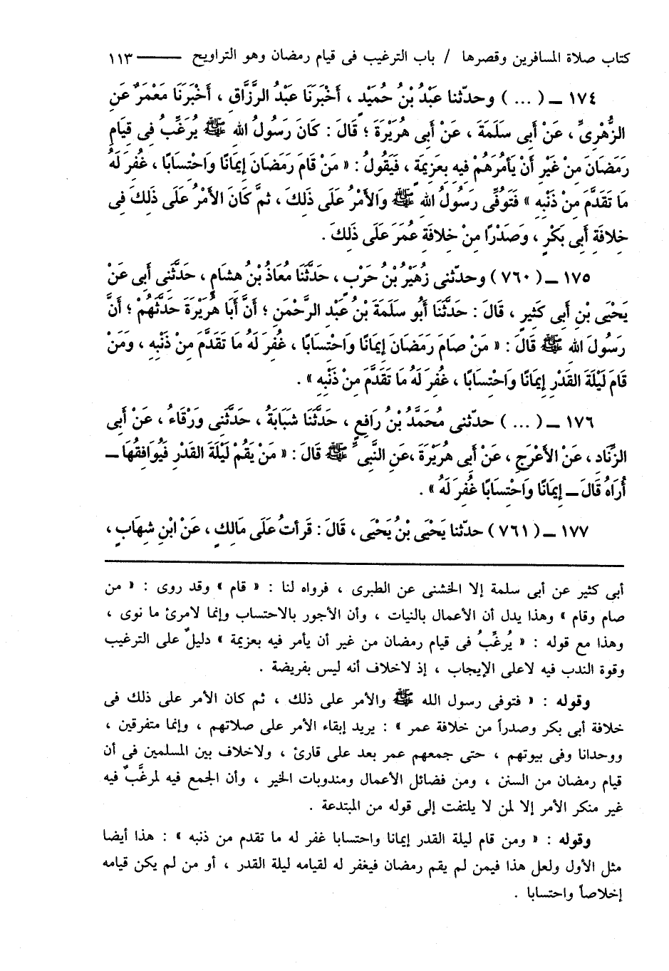 174 - (...) وحدّثنا عَبْدُ بْنُ حُمَيْدٍ، أَخْبَرَنَا عَبْدُ الرَّزَّاقِ، أَخْبَرَنَا مَعْمَرٌ عَنِ الزُّهْرِىِّ، عَنْ أَبِى سَلَمَةَ، عَنْ أَبِى هُرَيْرَةَ؛ قَالَ: كَانَ رَسُولُ اللهِ صَلَّى اللهُ عَلَيْهِ وَسَلَّمَ يُرَغِّبُ فِى قِيَامِ رَمَضَانَ مِنْ غَيْرِ أَنْ يَأمُرَهُمْ فِيهِ بِعَزِيمَةٍ، فَيَقُولُ: " مَنْ قَامَ رَمَضَانَ إِيمَانًا وَاحْتِسَابًا، غُفِرَ لَهُ مَا تَقَدَّمَ مِنْ ذَنْبِهِ " فَتَوُفِّى رَسُولُ اللهِ صَلَّى اللهُ عَلَيْهِ وَسَلَّمَ وَالأَمْرُ عَلَى ذَلِكَ، ثُمَّ كَانَ الأَمْرُ عَلَى ذَلِكَ فِى خِلافَةِ أَبِى بَكْرٍ، وَصَدْرًا مِنْ خِلافَةِ عُمَرَ عَلَى ذَلِكَ.