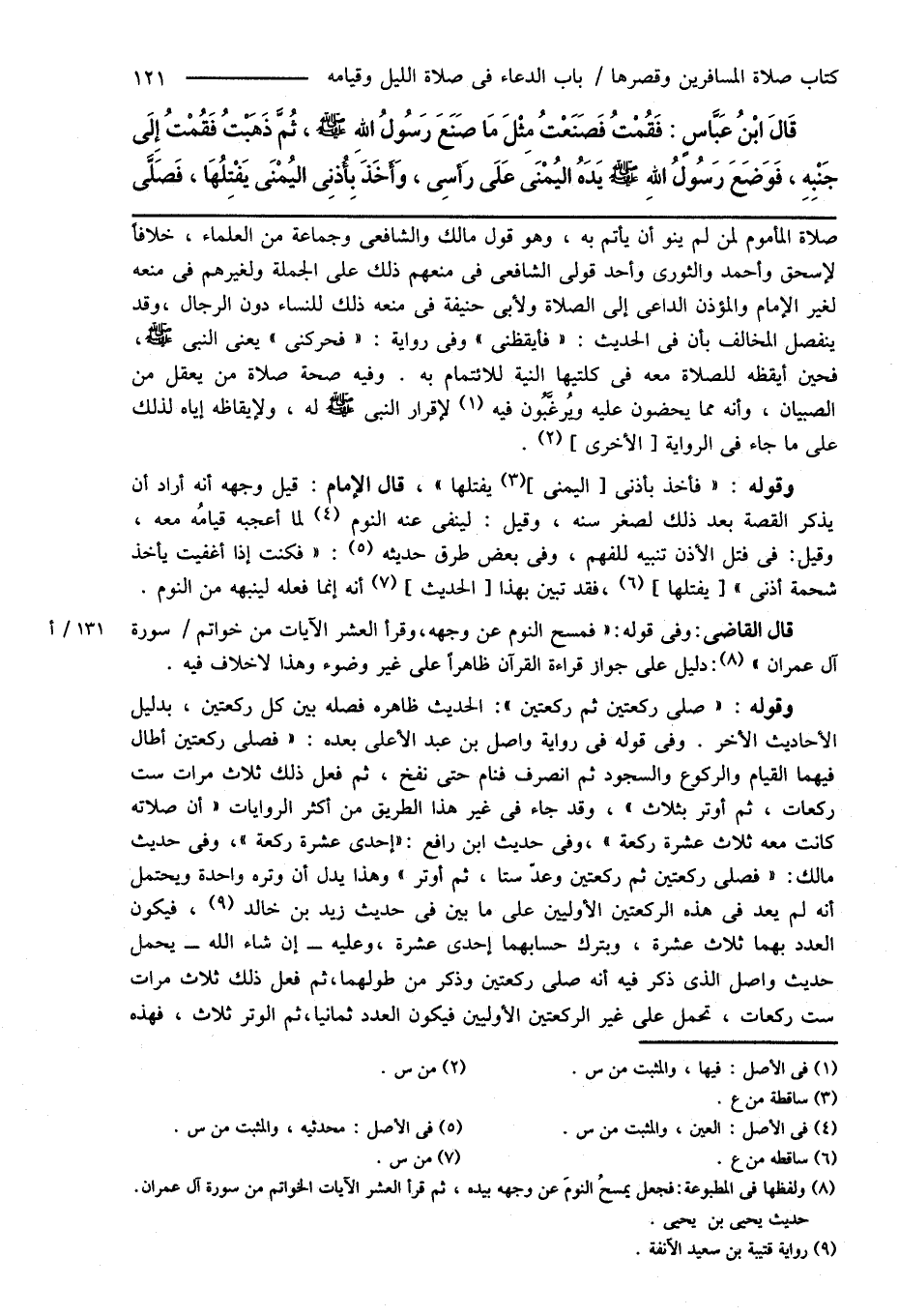 وقوله: " فأخذ بأذنى [اليمنى] (¬3) يفتلها "، قال الإمام: قيل وجهه أنه أراد أن يذكر القصة بعد ذلك لصغر سنه، وقيل: لينفى عنه النوم (¬4) لما أعجبه قيامُه معه، وقيل: فى فتل الأذن تنبيه للفهم، وفى بعض طرق حديثه (¬5): " فكنت إذا أغفيت يأخذ شحمة أذنى " [يفتلها] (¬6)، فقد تبين بهذا [الحديث] (¬7) أنه إنما فعله لينبهه من النوم.