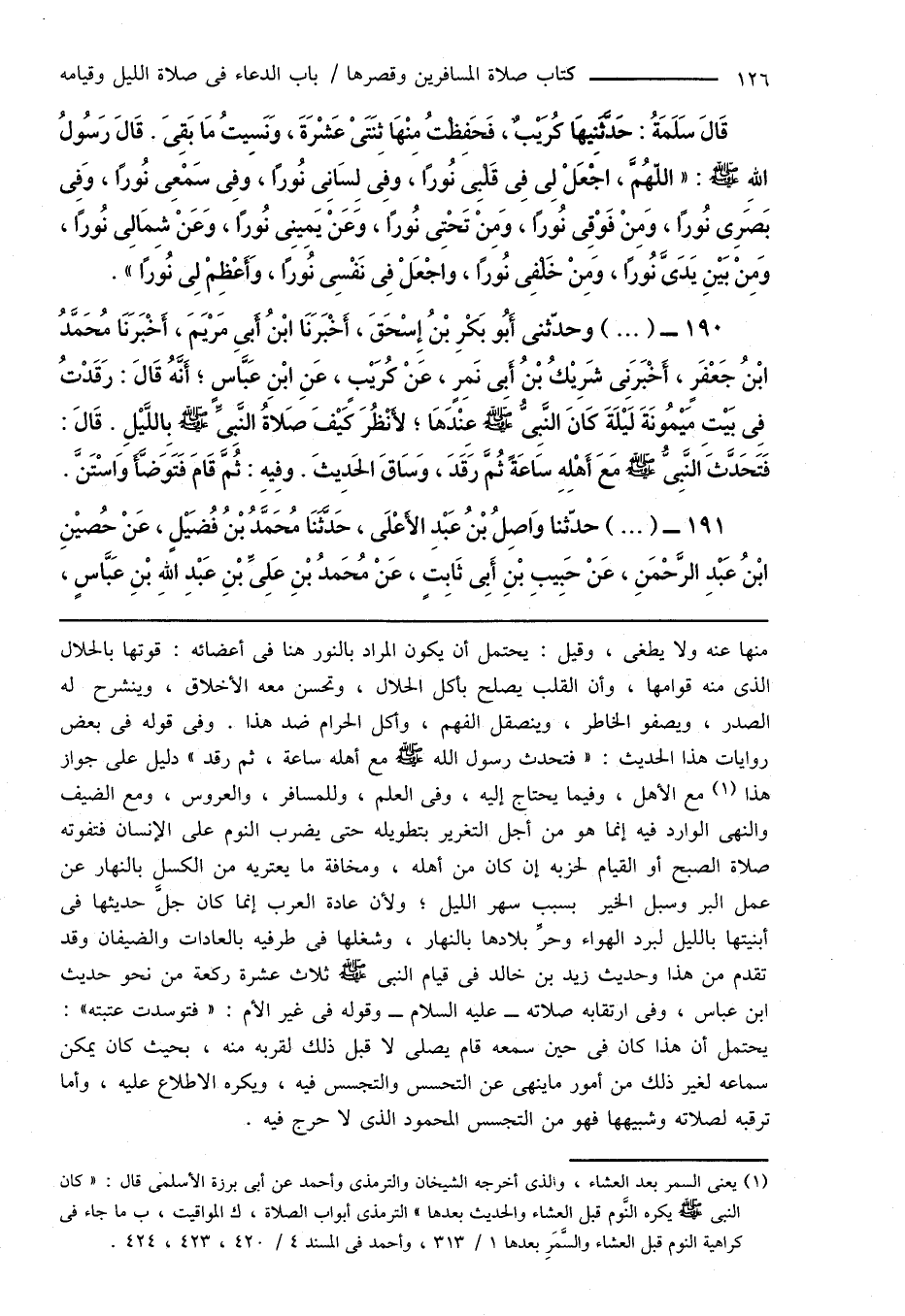 منها عنه ولا يطغى، وقيل: يحتمل أن يكون المراد بالنور هنا فى أعضائه: قوتها بالحلال الذى منه قوامها، وأن القلب يصلح بأكل الحلال، وتحسن معه الأخلاق، وينشرح له الصدر، ويصفو الخاطر، وينصقل الفهم، وأكل الحرام ضد هذا. وفى قوله فى بعض روايات هذا الحديث: " فتحدث رسول الله صَلَّى اللهُ عَلَيْهِ وَسَلَّمَ مع أهله ساعة، ثم رقد " دليل على جواز هذا (¬1) مع الأهل، وفيما يحتاج إليه، وفى العلم، وللمسافر، والعروس، ومع الضيف والنهى الوارد فيه إنما هو من أجل التغرير بتطويله حتى يضرب النوم على الإنسان فتفوته صلاة الصبح أو القيام لحزبه إن كان من أهله، ومخافة ما يعتريه من الكسل بالنهار عن عمل البر وسبل الخير بسبب سهر الليل؛ ولأن عادة العرب إنما كان جل حديثها فى أبنيتها بالليل لبرد الهواء وحرِّ بلادها بالنهار، وشغلها فى طرفيه بالعادات والضيفان وقد تقدم من هذا وحديث زيد بن خالد فى قيام النبى صَلَّى اللهُ عَلَيْهِ وَسَلَّمَ ثلاث عشرة ركعة من نحو حديث ابن عباس، وفى ارتقابه صلاته - عليه السلام - وقوله فى غير الأم: " فتوسدت عتبته ": يحتمل أن هذا كان فى حين سمعه قام يصلى لا قبل ذلك لقربه منه، بحيث كان يمكن سماعه لغير ذلك من أمور ما ينهى عن التحسس والتجسس فيه، ويكره الاطلاع عليه، وأما ترقبه لصلاته وشبيهها فهو من التجسس المحمود الذى لا حرج فيه.
