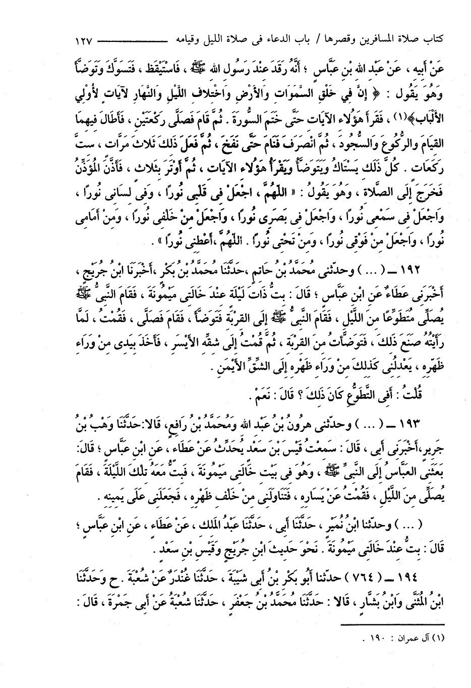 193 - (...) وحدَّثنى هَارُونُ بْنُ عَبْدِ اللهِ وَمُحَمَّدُ بْنُ رَافِعٍ، قَالا: حَدَّثَنَا وَهْبُ بْنُ جَرِيرٍ، أَخْبَرَنِى أَبِى، قَالَ: سَمِعْتُ قَيْسَ بْنَ سَعْدٍ يُحَدِّثُ عَنْ عَطَاءٍ، عَنِ ابْنِ عَبَّاسٍ؛ قَالَ: بَعَثَنِى الْعَبَّاسُ إِلَى النَّبِىِّ صَلَّى اللهُ عَلَيْهِ وَسَلَّمَ، وَهُوَ فِى بَيْتِ خَالَتِى مَيْمُونَةَ، فَبِتُّ مَعَهُ تِلْكَ اللَّيْلَةَ، فَقَامَ يُصَلِّى مِنَ اللَّيْلِ، فَقُمْتُ عَنْ يَسَارِهِ، فَتَنَاوَلَنِى مِنْ خَلْفِ ظَهْرِهِ، فَجَعَلَنِى عَلَى يَمِينِهِ.