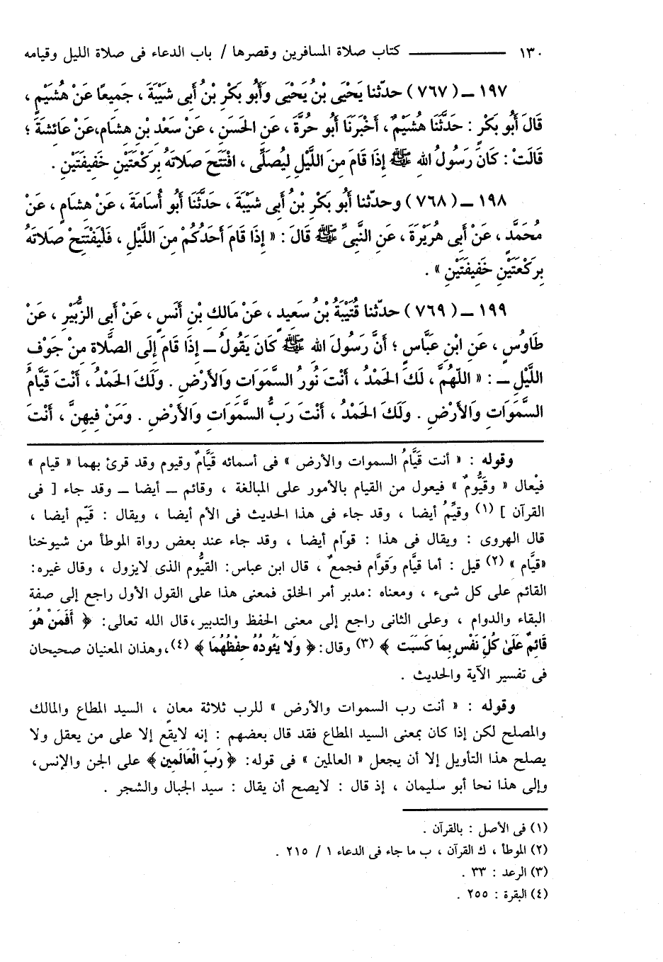 199 - (769) حدّثنا قُتَيْبَةُ بْنُ سَعِيدٍ، عَنْ مَالِكِ بْنِ أَنَسٍ، عَنْ أَبِى الزُّبَيْرِ، عَنْ طَاوُسٍ، عَنِ ابْنِ عَبَّاسٍ؛ أَنَّ رَسُولَ اللهِ صَلَّى اللهُ عَلَيْهِ وَسَلَّمَ كَانَ يَقُولُ - إِذَا قَامَ إِلَى الصَّلاةِ مِنْ جَوْفِ اللَّيْلِ -: " اللهُمَّ، لَكَ الحَمْدُ، أَنْتَ نُورُ السَّمَاوَاتِ وَالأَرْضِ. وَلَكَ الحَمْدُ، أَنْتَ قَيَّامُ السَّمَاوَاتِ وَالأَرْضِ. وَلَكَ الحَمْدُ، أَنْتَ رَبُّ السَّمَاوَاتِ وَالأَرْضِ. وَمَنْ فِيهِنَّ، أَنْتَ