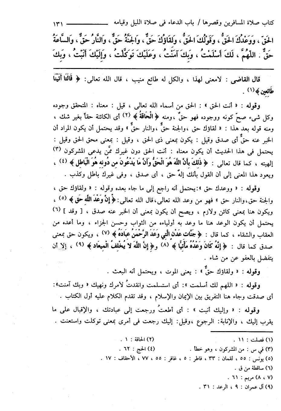 الحَقّ، وَوَعْدُكَ الحَقُّ، وَقَوْلُكَ الحَقُّ، وَلِقَاؤُكَ حَقٌّ، وَالجَنَّةُ حَقٌّ، وَالنَّارُ حَقٌّ، وَالسَّاعَةُ حَقٌّ. اللَّهُمَّ، لَكَ أَسْلَمْتُ، وَبِكَ آمَنْتُ، وَعَلَيْكَ تَوَكَّلْتُ، وَإِلَيْكَ أَنَبْتُ، وَبِكَ
