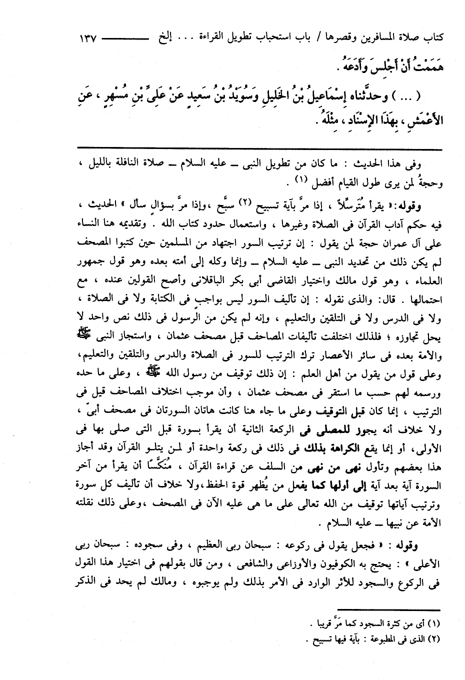 وقوله: " يقرأ مُتَرسِّلاً، إذا مرَّ بآية تسبيح (¬2) سبَّح، وإذا مرَّ بسؤالٍ سأل " الحديث، فيه حكم آداب القرآن فى الصلاة وغيرها، واستعمال حدود كتاب الله وتقديمه هنا النساء على آل عمران حجة لمن يقول: إن ترتيب السور اجتهاد من المسلمين حين كتبوا المصحف لم يكن ذلك من تحديد النبى - عليه السلام - وإنما وكله إلى أمته بعده وهو قول جمهور العلماء، وهو قول مالك واختيار القاضى أبى بكر الباقلانى وأصح القولين عنده، مع احتمالها. قال: والذى نقوله: إن تأليف السور ليس بواجبٍ فى الكتابة ولا فى الصلاة، ولا فى الدرس ولا فى التلقين والتعليم، وإنه لم يكن من الرسول فى ذلك نص واحد لا يحل تجاوزه، فلذلك اختلفت تأليفات المصاحف قبل مصحف عثمان، واستجاز النبى صَلَّى اللهُ عَلَيْهِ وَسَلَّمَ والأمة بعده فى سائر الأعصار ترك الترتيب للسور فى الصلاة والدرس والتلقين والتعليم، وعلى قول من يقول من أهل العلم: إن ذلك توقيف من رسول الله صَلَّى اللهُ عَلَيْهِ وَسَلَّمَ، وعلى ما حده ورسمه لهم حسب ما استقر فى مصحف عثمان، وأن موجب اختلاف المصاحف قيل فى الترتيب، إنما كان قبل التوقيف وعلى ما جاء هنا كانت هاتان السورتان فى مصحف أبىّ، ولا خلاف أنه يجور للمصلى فى الركعة الثانية أن يقرأ بسورة قبل التى صلى بها فى الأولى، أو إنما يقع الكراهة بذلك فى ذلك فى ركعة واحدة أو لمن يتلو القرآن وقد أجاز هذا بعضهم وتأول نهى من نهى من السلف عن قراءة القرآن، مُنَكِّسًا أن يقرأ من آخر السورة آية بعد آية إلى أولها كما يفعل من يُظهر قوة الحفظ، ولا خلاف أن تأليف كل سورة وترتيب آياتها توقف من الله تعالى على ما هى عليه الآن فى المصحف، وعلى ذلك نقلته الأمة عن نبيها - عليه السلام.