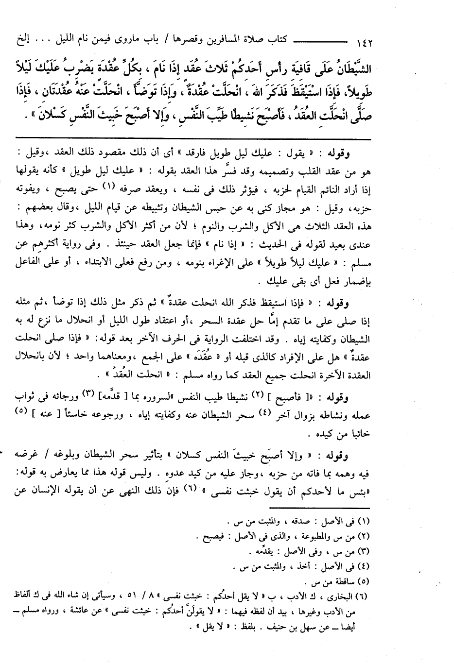 الشَّيْطَانُ عَلَى قَافِيَةِ رَأسِ أَحَدِكُمْ ثَلاثَ عُقَدٍ إِذَا نَامَ، بِكُلِّ عُقْدَةٍ يَضْرِبُ عَلَيْكَ لَيْلاً طَوِيلاً، فَإِذَا اسْتَيْقَظَ فَذَكَرَ اللهَ، انْحَلَّتْ عُقدَةٌ، وَإِذَا تَوَضَّأَ، انْحَلَّتْ عَنْهُ عُقْدَتَانِ، فَإِذَا صَلَّى انْحَلَّتِ العُقَدُ، فَأَصْبَحَ نَشِيطًا طَيِّبَ النَّفْسِ، وَإِلا أَصْبَحَ خَبِيثَ النَّفْسِ كَسْلانَ ".