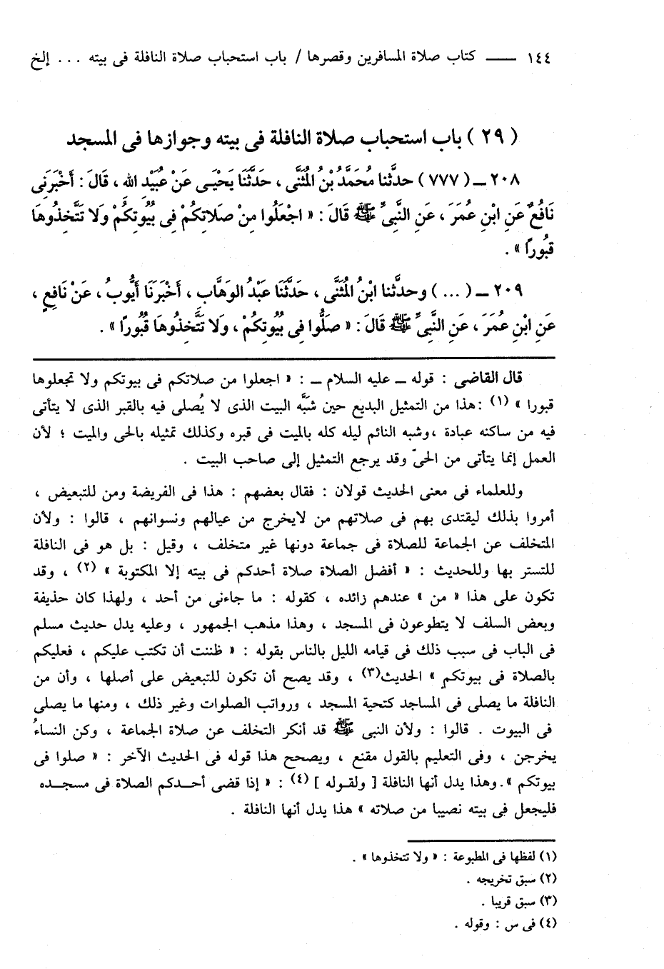 208 - (777) حدَّثنا مُحَمَّدُ بْنُ المُثَنَّى، حَدَّثَنَا يَحْيَى عَنْ عُبَيْدِ اللهِ، قَالَ: أَخْبَرَنِى نَافُعٌ عَنِ ابْنِ عُمَرَ، عَنِ النَّبِىِّ صَلَّى اللهُ عَلَيْهِ وَسَلَّمَ قَالَ: " اجْعَلُوا مِنْ صَلاتِكُمْ فِى بُيُوتِكُمْ وَلا تَتَّخِذُوهَا قبُورًا ".