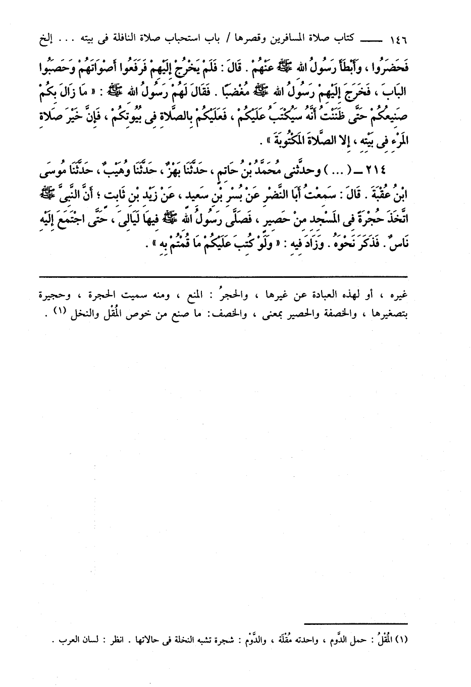 214 - (...) وحدَّثنى مُحَمَّدُ بْنُ حَاتِمٍ، حَدَّثَنَا بَهْزٌ، حَدَّثَنَا وُهَيْبٌ، حَدَّثَنَا مُوسَى ابْنُ عُقْبَةَ. قَالَ: سَمِعْتُ أَبَا النَّضْرِ عَنْ بُسْرِ بْنِ سَعِيدٍ، عَنْ زَيْدِ بْنِ ثَابِتٍ؛ أَنَّ النَّبِىَّ صَلَّى اللهُ عَلَيْهِ وَسَلَّمَ اتَّخَذَ حُجْرَةً فِى المَسْجَدِ مِنْ حَصِيرٍ، فَصَلَّى رَسُولُ اللهِ صَلَّى اللهُ عَلَيْهِ وَسَلَّمَ فِيهَا لَيَالِىَ، حَتَّى اجْتَمَعَ إِلَيْهِ نَاسٌ. فَذَكَرَ نَحْوَهُ. وَزَادَ فِيهِ: " وَلَوْ كُتِبَ عَلَيْكُمْ مَا قُمْتُمْ بِهِ ".