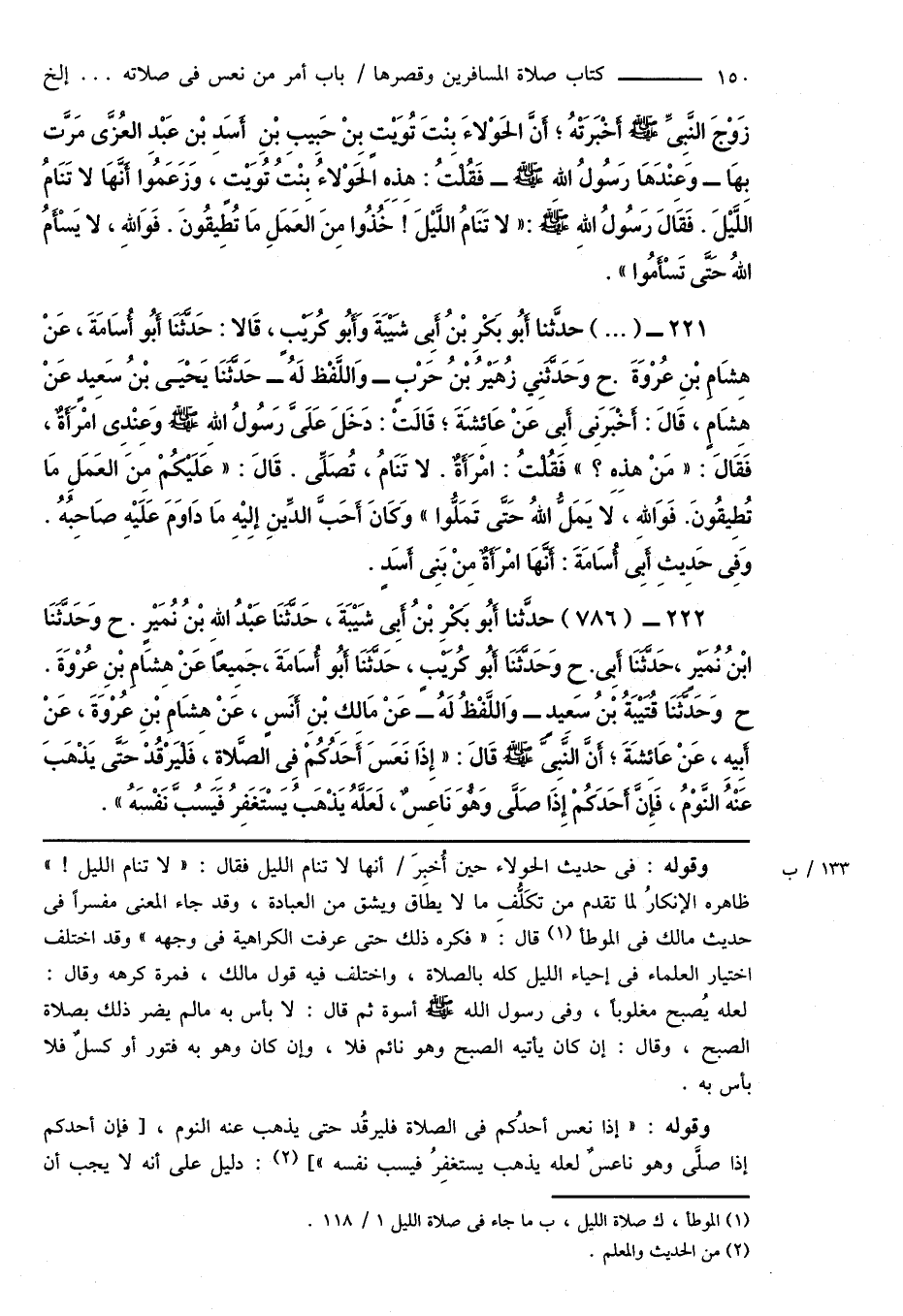 222 - (786) حدَّثنا أَبُو بَكْرِ بْنُ أَبِى شَيْبَةَ، حَدَّثَنَا عَبْدُ اللهِ بْنُ نُمَيرٍ. ح وَحَدَّثَنَا ابْنُ نُمَيْرٍ، حَدَّثَنَا أَبِى. ح وَحَدَّثَنَا أَبُو كُرَيْبٍ، حَدَّثَنَا أَبُو أُسَامَةَ، جَمِيعًا عَنْ هِشَامِ بْنِ عُرْوَةَ. ح وَحَدَّثَنَا قُتَيْبَةُ بْنُ سَعِيدٍ - واللَّفْظُ لَهُ - عَن مَالِكِ بْنِ أَنَسٍ، عَنْ هِشَامِ بْنِ عُرْوَةَ، عَنْ أَبِيهِ، عَنْ عَائِشَةَ؛ أَنَّ النَّبِىَّ صَلَّى اللهُ عَلَيْهِ وَسَلَّمَ قَالَ: " إِذَا نَعَسَ أَحَدُكُمْ فِى الصَّلاةِ، فَلْيَرْقُدْ حَتَّى يَذْهَبَ عَنْهُ النَّوْمُ، فَإِنَّ أَحَدَكُمْ إِذَا صَلَّى وَهُوَ نَاعِسٌ، لَعَلَّهُ يَذْهَبُ يَسْتَغَفِرُ فيَسُبَّ نَفْسَهُ ".