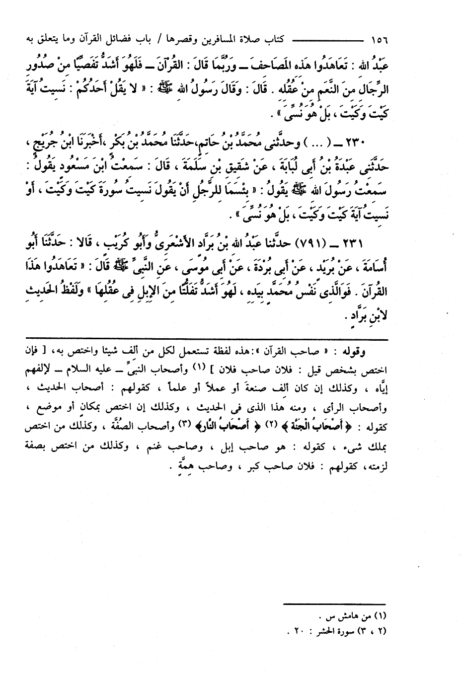 231 - (791) حدَّثنا عَبْدُ اللهِ بْنُ بَرَّادٍ الأَشْعَرِىُّ وَأَبُو كُرَيْبٍ، قَالا: حَدَّثَنَا أَبُو أُسَامَةَ، عَنْ بُرَيْدٍ، عَنْ أَبِى بُرْدَةَ، عَنْ أَبِى مُوسَى، عَنِ النَّبِىِّ صَلَّى اللهُ عَلَيْهِ وَسَلَّمَ قَالَ: " تَعَاهَدُوا هَذَا القُرْآنَ. فَوَالَّذِى نَفْسُ مُحَمَّدٍ بِيَدِهِ، لَهُوَ أَشَدُّ تَفَلُّتًا مِنَ الإِبِلِ فِى عُقُلِهَا " وَلَفْظُ الحَدِيثِ لابْنِ بَرَّادٍ.
