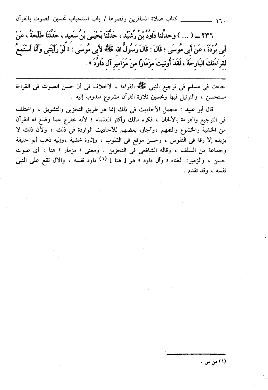 236 - (...) وحدَّثنا دَاوُدُ بْنُ رُشَيْدٍ، حَدَّثَنَا يَحْيَى بْنُ سَعِيدٍ، حَدَّثَنَا طَلْحَةُ، عَنْ أَبِى بُرْدَةَ، عَنْ أَبِى مُوسَى؛ قَالَ: قَالَ رَسُول اللهِ صَلَّى اللهُ عَلَيْهِ وَسَلَّمَ لأَبِى مُوسَى: " لَوْ رَأَيْتَنِى وَأَنَا أَسْتَمِعُ لِقِرَاءَتِكَ البَارِحَةَ، لَقَدْ أُوتِيتَ مِزْمَارًا مِنْ مَزَامِيرِ آلِ دَاوُدَ ".