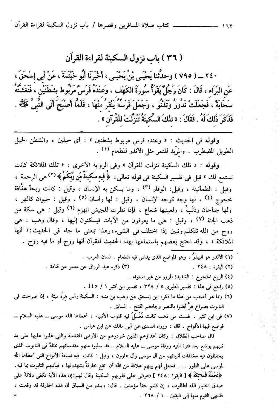 240 - (795) وحدَّثنا يَحْيَى بْنُ يَحْيَى، أَخْبَرَنَا أَبُو خَيْثَمَةَ، عَنْ أَبِى إِسْحَاقَ، عَنِ البَرَاءِ، قَالَ: كَانَ رَجُلٌ يَقْرَأُ سُورَةَ الكَهْفِ، وَعِنْدَهُ فَرَسٌ مَرْبُوطٌ بِشَطَنَيْنِ، فَتَغَشَّتْهُ سَحَابَةٌ، فَجَعَلَتْ تَدُورُ وَتَدْنُو، وَجَعَلَ فَرَسُهُ يَنْفِرُ مِنْهَا، فَلَمَّا أَصْبَحَ أَتَى النَّبِىَّ صَلَّى اللهُ عَلَيْهِ وَسَلَّمَ. فَذَكرَ ذَلِكَ لَهُ. فَقَالَ: " تِلْكَ السَّكِينَةُ تَنَزَّلَتْ لِلْقُرْآنِ ".