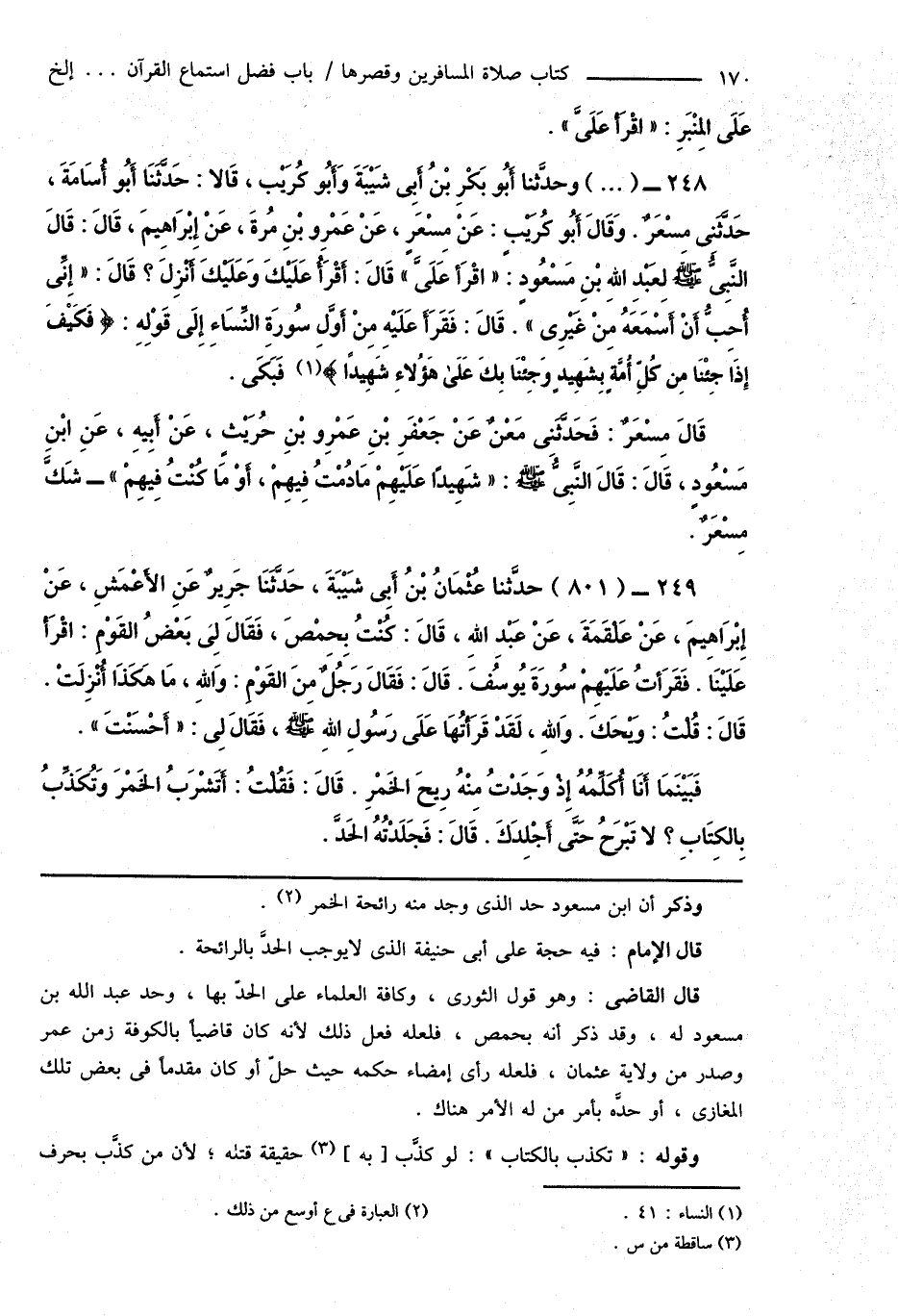 248 - (...) وحدَّثنا أَبُو بَكْرِ بْنُ أَبِى شَيْبَةَ وَأَبُو كُرَيْبٍ، قَالا: حَدَّثَنَا أَبُو أُسَامَةَ، حَدَّثَنِى مِسْعَرٌ. وَقَالَ أَبُو كُرَيْبٍ: عَنْ مِسْعرٍ، عَنْ عَمْرِو بْنِ مُرةَ، عَنْ إِبْرَاهِيمَ، قَالَ: قَالَ النَّبِىُّ صَلَّى اللهُ عَلَيْهِ وَسَلَّمَ لِعَبْدِ اللهِ بْنِ مَسْعُودٍ: " اقْرَأ عَلَىَّ " قَالَ: أَقْرَأُ عَلَيْكَ وَعَلَيْكَ أُنْزِلَ؟ قَالَ: " إِنِّى أُحِبُّ أَنْ أَسْمَعَهُ مِنْ غَيْرِى ". قَالَ: فَقَرَأَ عَلَيْهِ مِنْ أَوَّلِ سُورَةِ النِّسَاءِ إِلَى قَوْلِهِ: {فَكَيْفَ إِذَا جِئْنَا مِن كُلِّ أُمَّةٍ بِشَهِيدٍ وَجِئْنَا بِكَ عَلَى هَؤُلاءِ شَهِيدًا} (¬1) فَبَكَى.