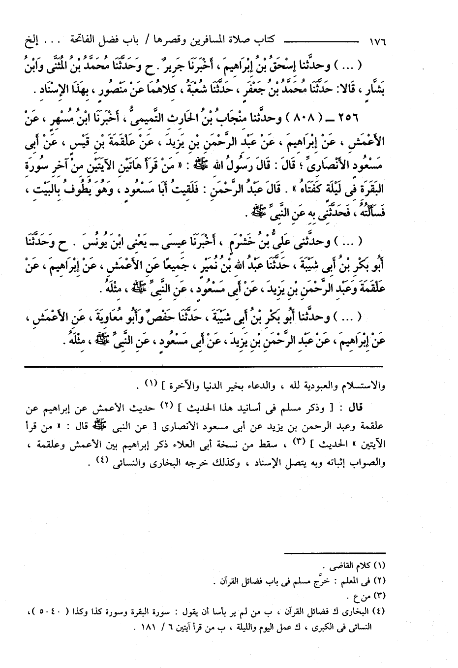 256 - (808) وحدَّثنا مِنْجَابُ بْنُ الْحَارِثِ التَّمِيمِىُّ، أَخْبَرَنَا ابْنُ مُسْهِرٍ، عَنْ الأَعْمَشِ، عَنْ إِبْرَاهِيمَ، عَنْ عَبْدِ الرَّحْمَنِ بْنِ يَزِيدَ، عَنْ عَلْقَمَةَ بْنِ قَيْسٍ، عَنْ أَبِى مَسْعُودٍ الأَنْصَارِىِّ، قَالَ: قَالَ رَسُولُ اللهِ صَلَّى اللهُ عَلَيْهِ وَسَلَّمَ: " مَنْ قَرَأَ هَاتَيْنِ الآيَتَيْنِ مِنْ آخِرِ سُورَةِ البَقَرَةِ فِى لَيْلَةٍ كَفَتَاهُ ". قَالَ عَبْدُ الرَّحْمَنِ: فَلَقِيتُ أَبَا مَسْعُودٍ، وَهُوَ يُطُوفُ بالبَيْتِ، فَسَأَلْتُهُ، فَحَدَّثَنِى بِهِ عَنِ النَّبِىِّ صَلَّى اللهُ عَلَيْهِ وَسَلَّمَ.