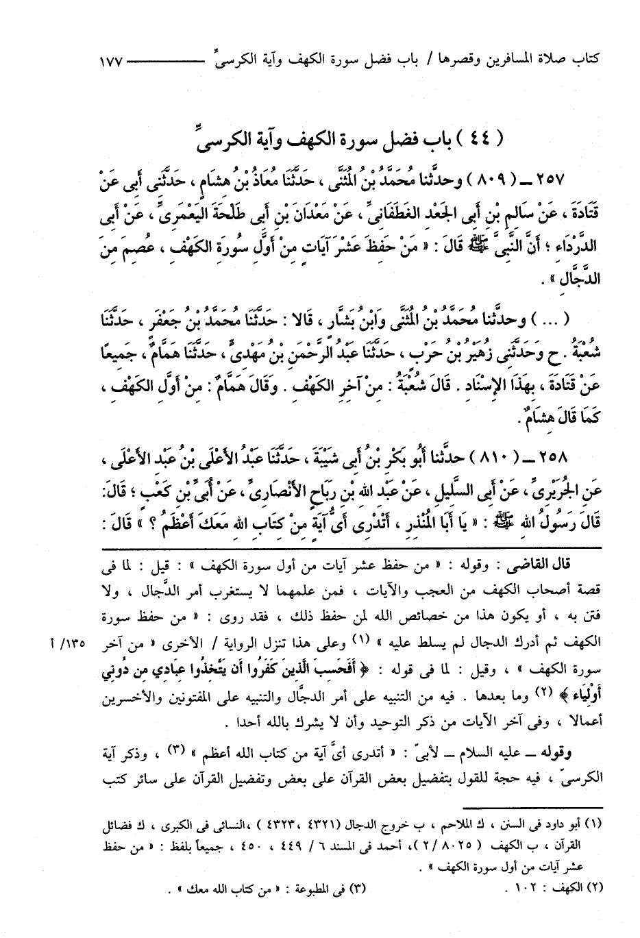 257 - (809) وحدَّثنا مُحَمَّدُ بْنُ المُثَنَّى، حَدَّثَنَا مُعَاذُ بْنُ هِشَامٍ، حَدَّثَنِى أَبِى عَنْ قَتَادَةَ، عَنْ سَالِمِ بْنِ أَبِى الجَعْدِ الغَطَفَانِىِّ، عَنْ مَعْدَانَ بْنِ أَبِى طَلْحَةَ اليَعْمَرِىِّ، عَنْ أَبِى الدَّرْدَاء؛ أَنَّ النَّبِىَّ صَلَّى اللهُ عَلَيْهِ وَسَلَّمَ قَالَ: " مَنْ حَفِظَ عَشْرَ آيَاتٍ مِنْ أَوَّلِ سُورَةِ الكَهْفِ، عُصِمَ مِنَ الدَّجَّالِ ".