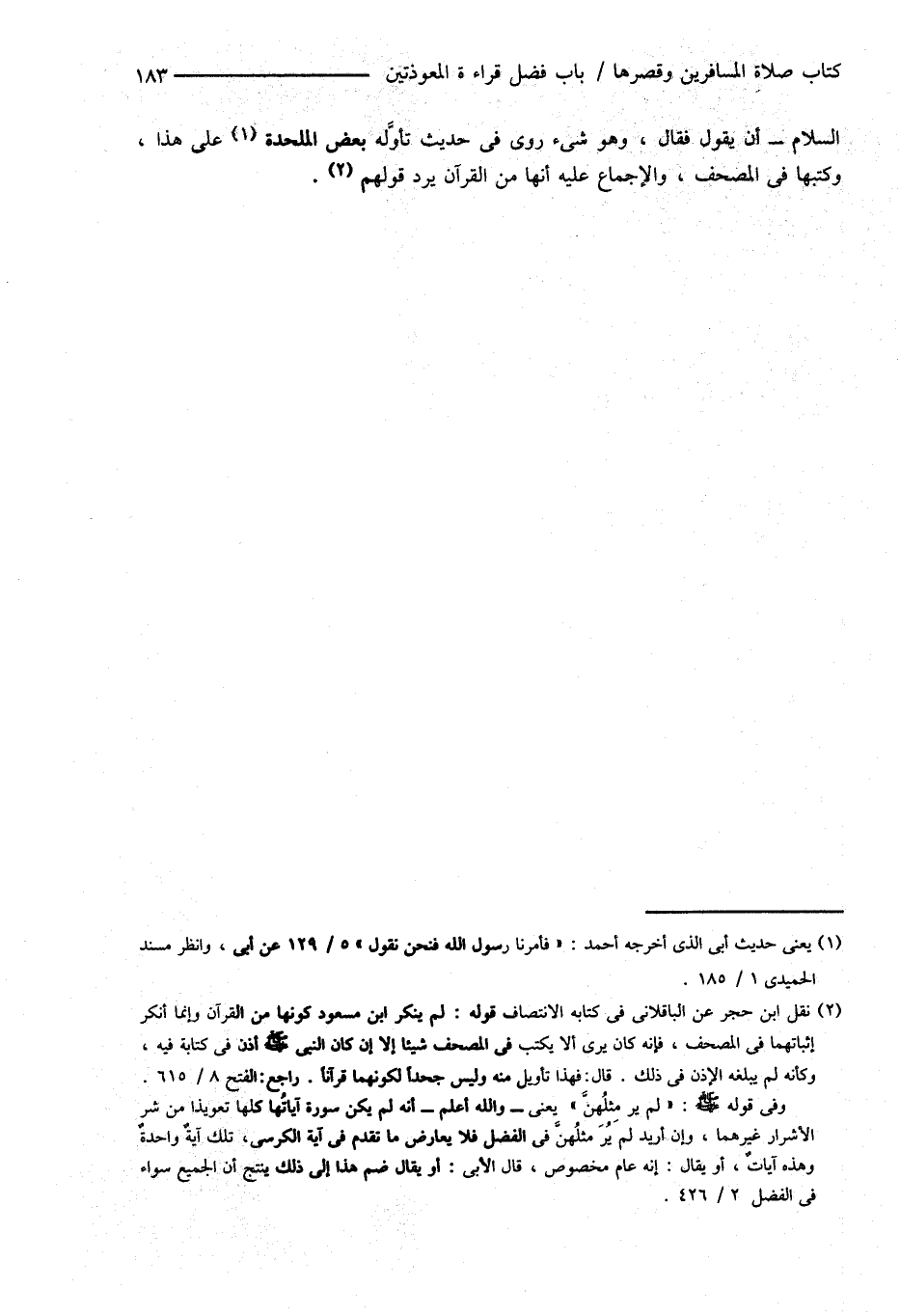 (¬2) نقل ابن حجر عن الباقلانى فى كتابه الانتصاف قوله: لم ينكر ابن مسعود كونها من القرآن وإنما أنكر إثباتهما فى المصحف، فإنه كان يرى ألا يكتب فى المصحف شيئاً إلا إن كان النبى صَلَّى اللهُ عَلَيْهِ وَسَلَّمَ أذن فى كتابته فيه، وكأنه لم يبلغه الإذن فى ذلك. قال: فهذا تأويل منه وليس جحداً لكونهما قرآناً. راجع: الفتح 8/ 615.