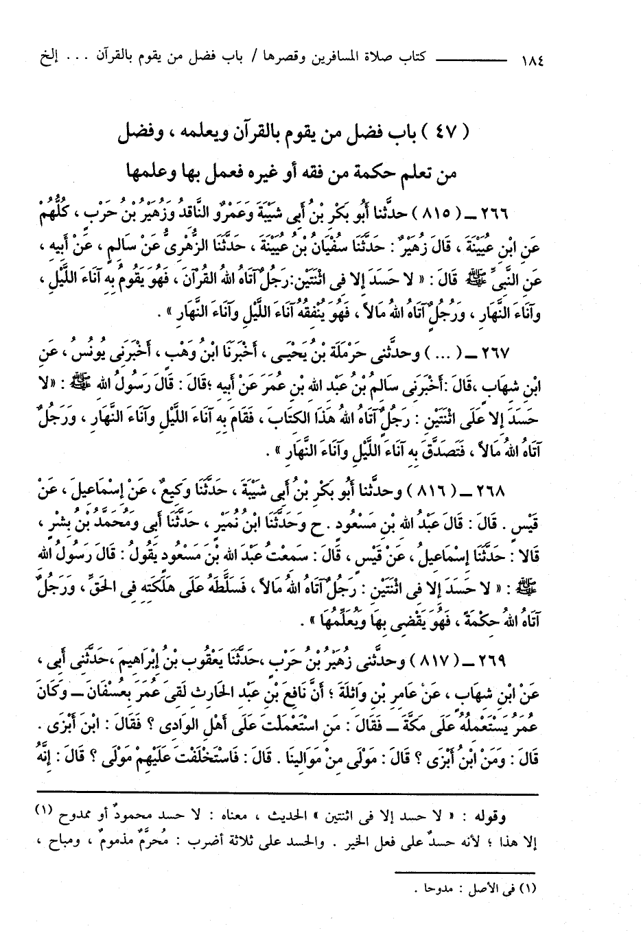 266 - (815) حدَّثنا أَبُو بَكْرِ بْنُ أَبِى شَيْبَةَ وَعَمْرٌو النَّاقِدُ وَزُهَيْرُ بْنُ حَرْبٍ، كُلُّهُمْ عَنِ ابْنِ عُيَيْنَةَ، قَالَ زُهَيرٌ: حَدَّثَنَا سُفْيَانُ بْنُ عُيَيْنَةَ، حَدَّثَنَا الزُّهْرِىُّ عَنْ سَالِمٍ، عَنْ أَبِيهِ، عَنِ النَّبِىِّ صَلَّى اللهُ عَلَيْهِ وَسَلَّمَ قَالَ: " لا حَسَدَ إِلا فِى اثْنَتَيْن: رَجُلاً آتَاهُ اللهُ القُرْآنَ، فَهُوَ يَقُومُ بِهِ آنَاءَ اللَّيْلَ، وآنَاءَ النَّهَارِ، وَرُجُلاً آتَاهُ اللهُ مَالاً، فَهُوَ يُنْفِقُهُ آنَاءَ اللَّيْلِ وَآنَاءَ النَّهَارِ ".