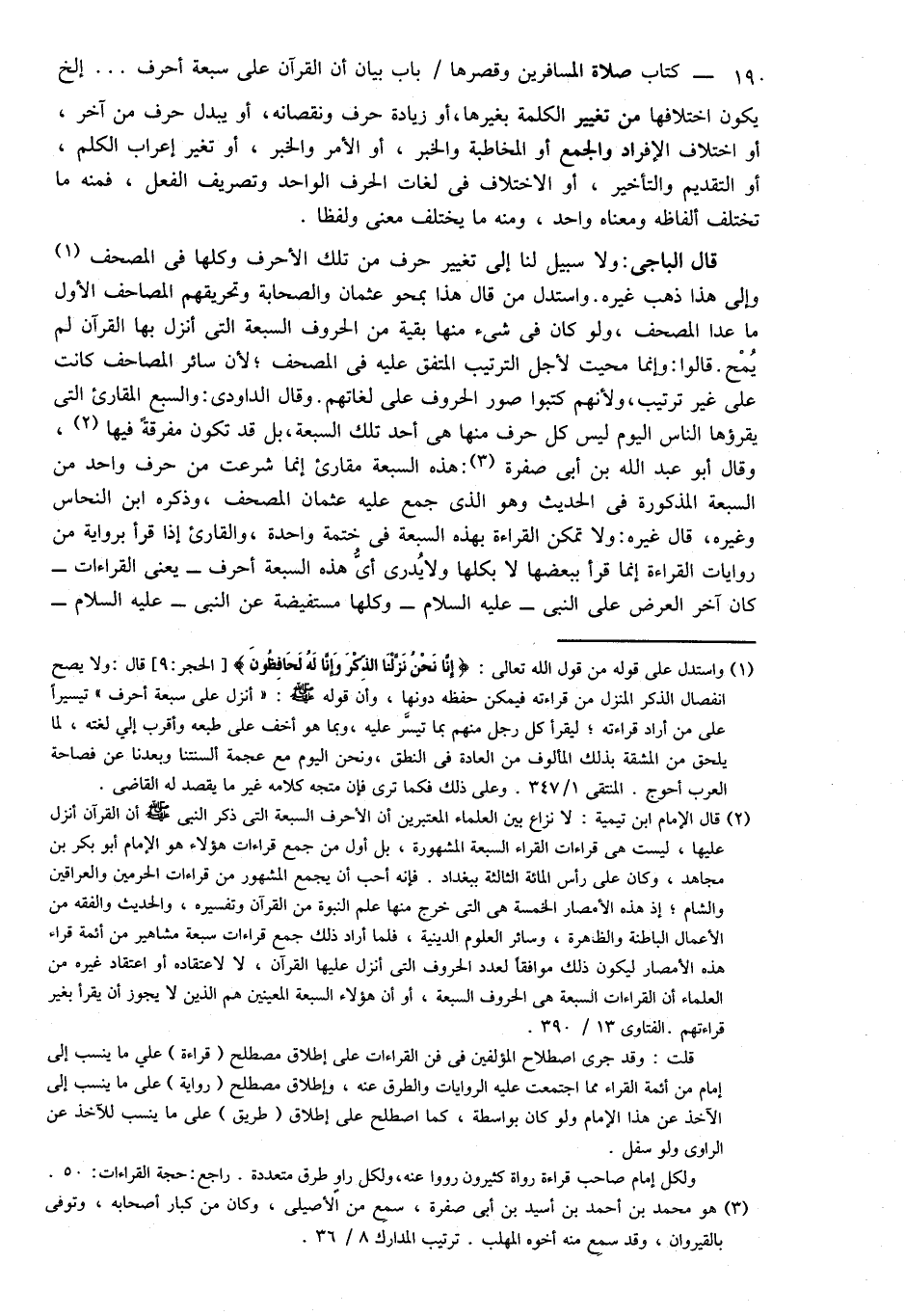 (¬1) واستدل على قوله من قول الله تعالى: {إِنَّا نَحْنُ نَزَّلْنَا الذِّكْرَ وَإِنَّا لَهُ لَحَافِظُونَ} [الحجر: 9] قال: ولا يصح انفصال الذكر المنزل من قراءته فيمكن حفظه دونها، وأن قوله صَلَّى اللهُ عَلَيْهِ وَسَلَّمَ: " أنزل على سبعة أحرف " تيسيراً على من أراد قراءته؛ ليقرأ كل رجل منهم بما تيسَّر عليه، وبما هو أخف على طبعه وأقرب إلى لغته، لما يلحق من المشقة بذلك المألوف من العادة فى النطق، ونحن اليوم مع عجمة ألسنتنا وبعدنا عن فصاحة العرب أحوج. المنتقى 1/ 347. وعلى ذلك فكما ترى فإن متجه كلامه غير ما يقصد له القاضى.